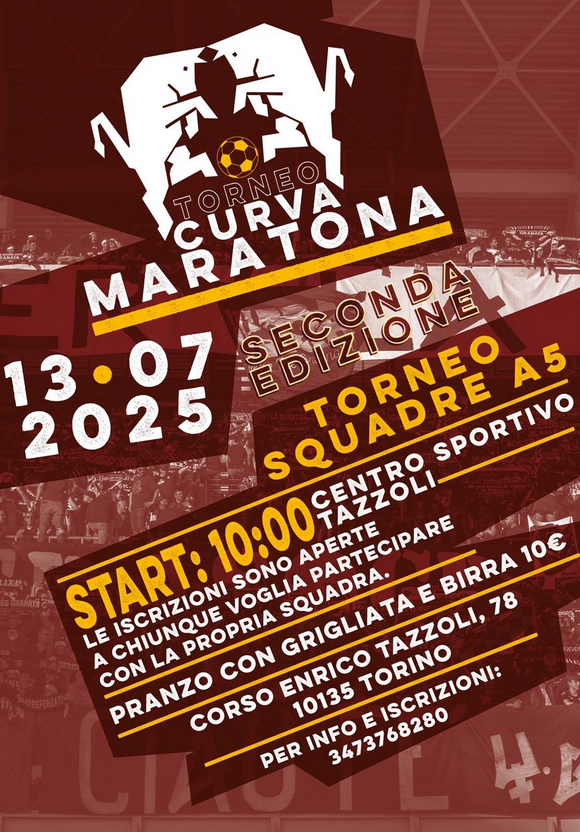 Dopo il successo dello scorso anno, a luglio partirà la seconda edizione del "Torneo Curva Maratona" torneo di Calcio a 5 organizzato dalla curva Maratona. Il torneo avrà luogo domenica 13 luglio alle ore 10:00 al Centro Sportivo Tazzoli in Corso Enrico Tazzoli, 78. Le iscrizioni sono aperte a chiunque voglia partecipare con la propria squadra. Inoltre, al prezzo di 10 euro verrà servito il pranzo che comprende grigliata e birra. Il torneo, preparato dal tifo organizzato granata, sarà un'occasione di aggregazione per tutti gli appassionati del Torino. Per info e inscrizioni al torneo contattare il numero 3473768280. A seguire la locandina del torneo.