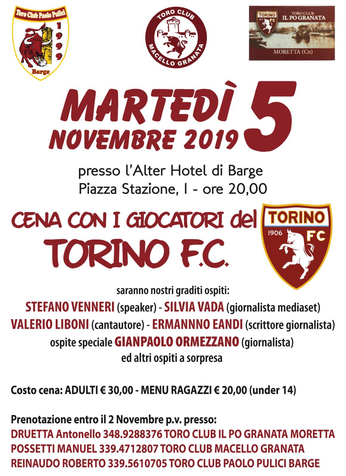 La serata è organizzata dai Toro Club Barge, Macello Granata e il Po Granata ed è richiesta la prenotazione entro il 2 novembre. Per maggiori dettagli visionare la locandina.