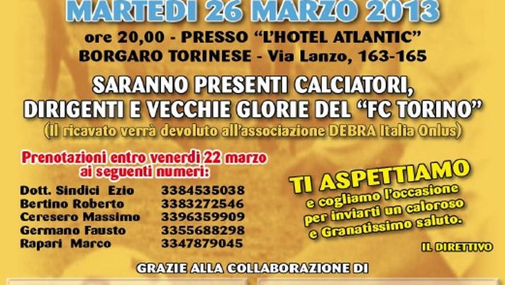 "Il Toro Club 'Borgaro Granata' organizza per martedì 26 Marzo una cena sociale organizzata in favore dell'associazione Debra, una Onlus per il sostegno ai bambini affetti dall'epidermolisi bollosa (bambini farfalla).