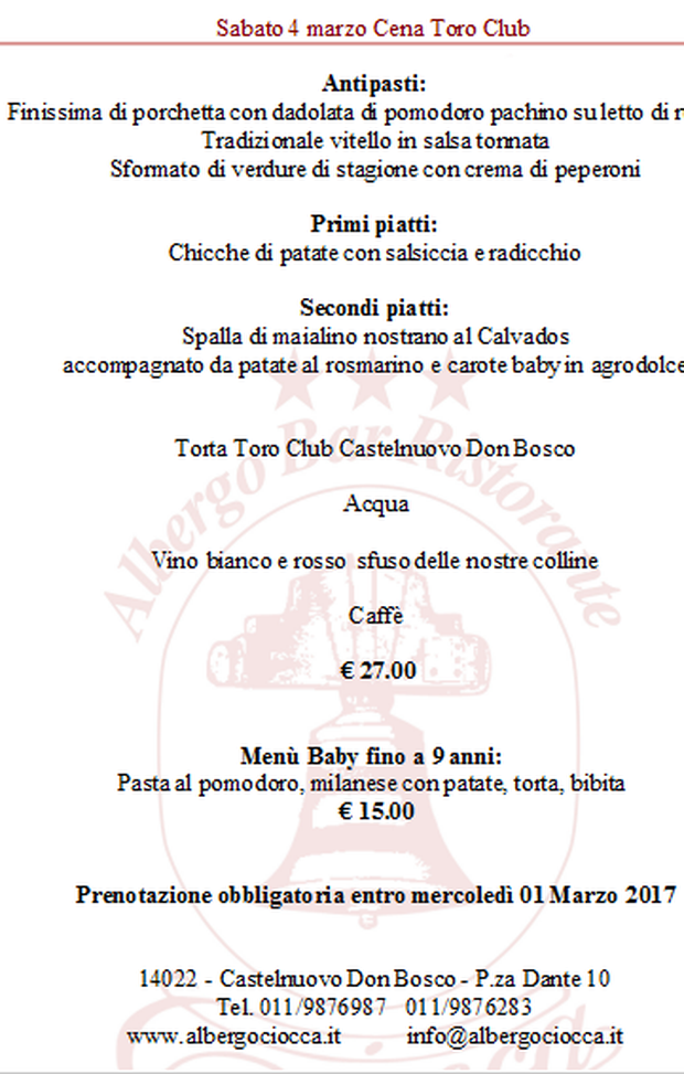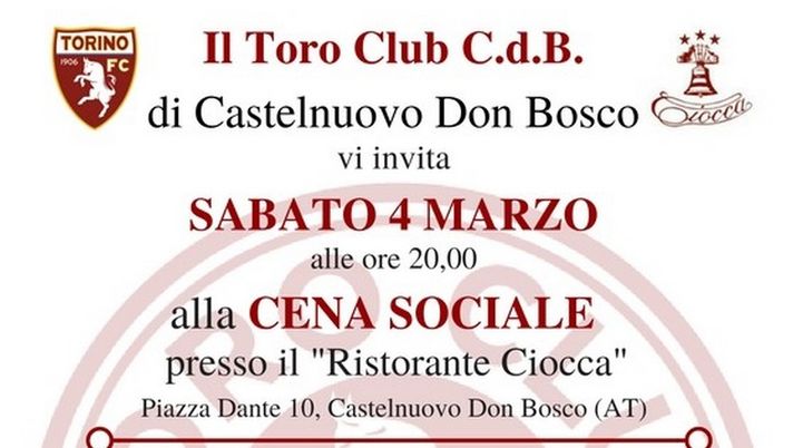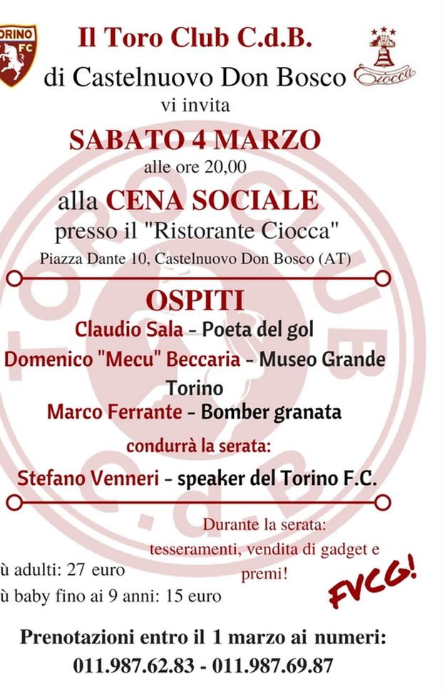 "Castelnuovo Don Bosco si tinge di Granata. Sabato 4 marzo il Toro Club locale festeggerà il secondo anno di fondazione con importanti ospiti : il Poeta del Gol Claudio Sala, il bomber Granata Marco Ferrante ed il Presidente del Museo del Grande Torino e Leggenda Granata Domenico Beccaria. Ad animare la serata è stato chiamato lo speaker ufficiale del Torino Football Club, Stefano Venneri, che coinvolgerà tutti i tifosi. La serata, come spesso accade con i club, sarà trasmessa in diretta su Facebook. La location sarà il Ristorante “Ciocca” di Castelnuovo Don Bosco.