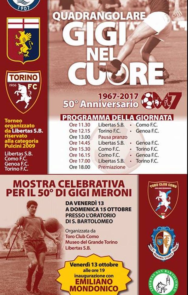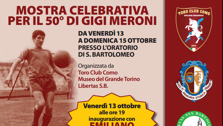 "Gigi Meroni, la Farfalla Granata, è deceduto ormai 50 anni fa: il Toro Club Como ha organizzato, per onorare la memoria del campione tragicamente scomparso, una mostra con foto e cimeli inediti appartenuti alla sfortunata stella granata proprio nella città di Como, nell'oratorio di San Bartolomeo. La mattina di domenica 15 ottobre sarà possibile assistere al quadrangolare tra Torino, Como, Genoa e Libertas, della categoria Pulcini (classe 2009).