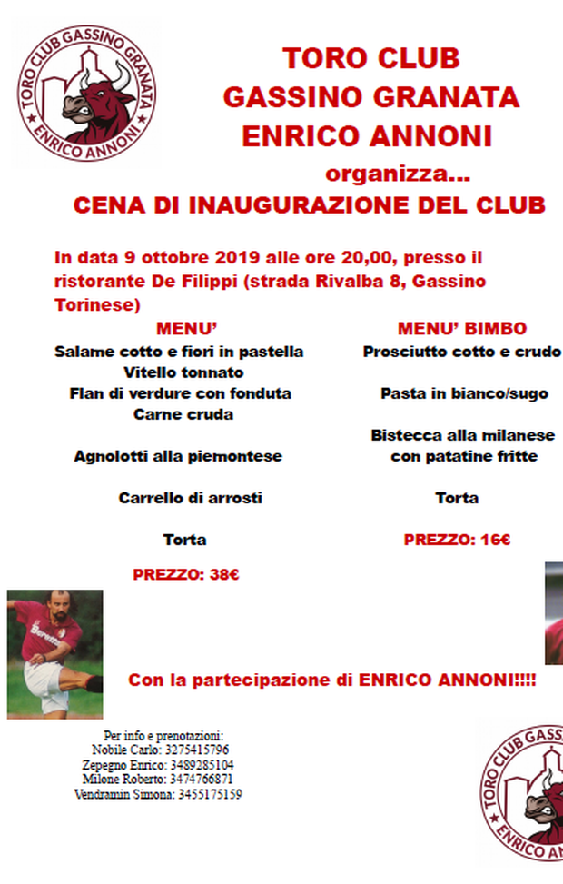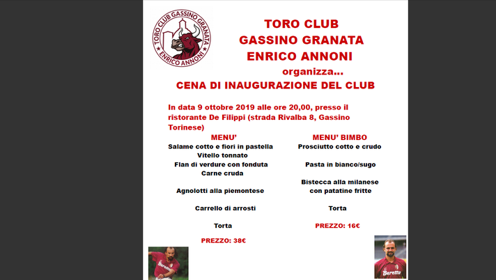 Il Toro Club Gassino Granata mercoledì 9 ottobre alle ore 20 organizza la cena di inaugurazione del club presso il ristorante De Filippi (strada Rivalba 8, Gassino Torinese). Dopo aver costituito il club a giugno, raggiungendo 250 iscritti, e aver ricevuto il riconoscimento ufficiale dal Torino FC, il club ha deciso di organizzare l'evento presso un ristorante locale. Alla cena prenderà parte anche l'ex difensore del Toro Enrico Annoni.