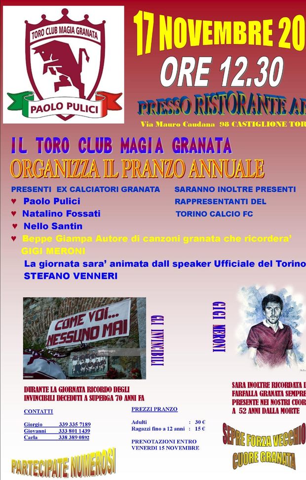 Domenica 17 novembre alle ore 12:30 si terrà il pranzo annuale organizzato dal Toro Club Magia Granata Paolo Pulici presso il ristorante Apra in via Mauro Caudana 98 a Castiglione Torinese. Saranno presenti gli ex giocatori granata Paolo Pulici, Natalino Fossati e Nello Santin. Beppe Giampa, autore di canzoni granata, ricorderà Gigi Meroni. Saranno presenti anche rappresentanti del Torino FC. La giornata sarà presentata dallo speaker ufficiale del Toro Stefano Venneri.