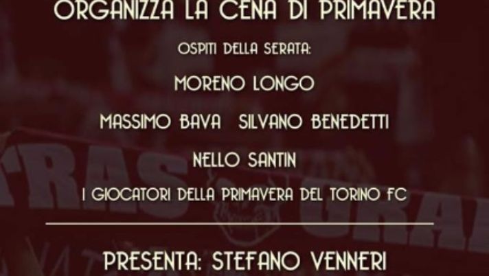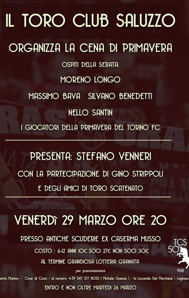 Venerdì 29 marzo alle 20 presso le Antiche Scuderie, ex Caserma Musso, ci sarà la cena sociale del Toro Club Saluzzo a cui prenderanno parte degli ospiti di grande importanza: Massimo Bava, Silvano Benedetti, Nello Santin e Moreno Longo. Oltre a loro parteciperanno anche i giocatori della Primavera in forza al Torino. L'evento sarà presentato dallo speaker granata Stefano Venneri e con la partecipazione anche di Gino Strippoli e di alcuni 'amici' di Toro Scatenato.