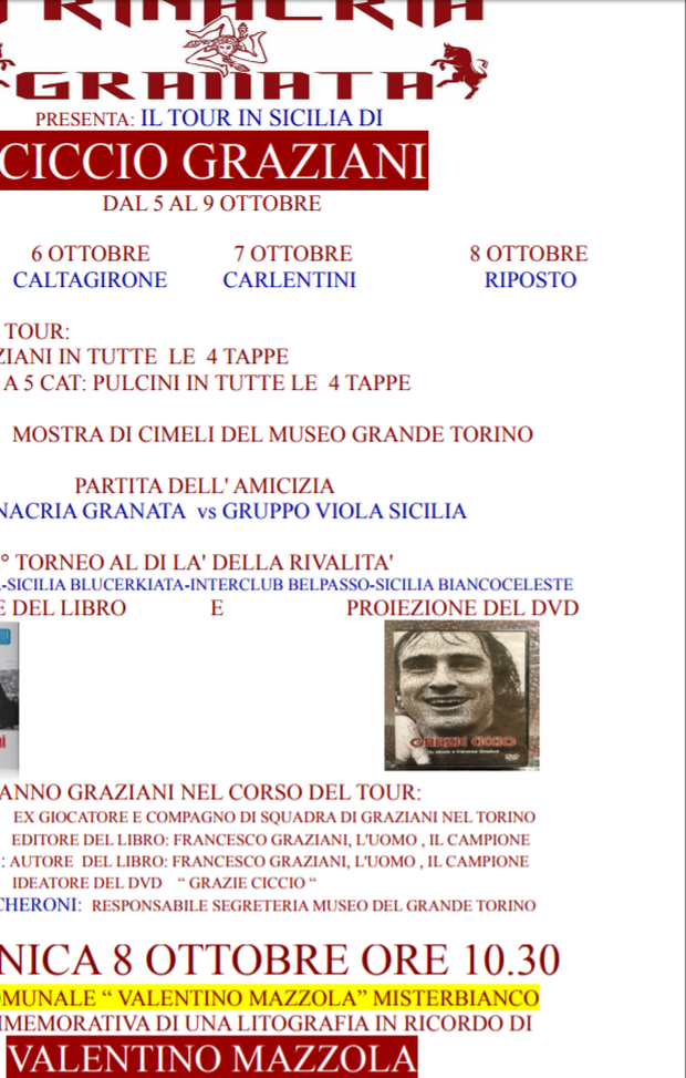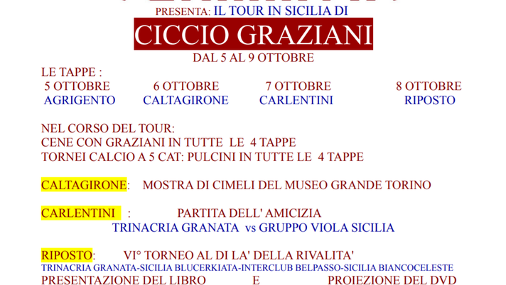 Il campione Francesco Graziani, vincitore dell'ultimo Scudetto con il Torino nel 1976, sarà protagonista di un Tour in Sicilia con il nuovo Toro Club Trinacria Granata. Questo tour avrà quattro tappe in città diverse, a partire da Agrigento, per poi spostarsi a Caltagirone, Carlentini e Riposto.