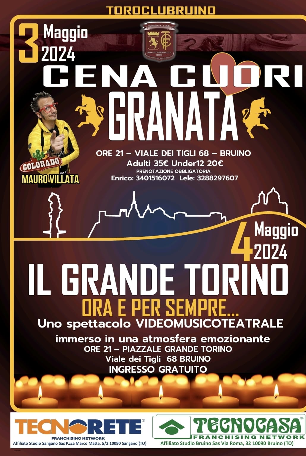 Un evento simile andrà in scena a Bruino (TO) nella serata di venerdì 3 maggio quando a partire dalle ore 21 si terrà la cena sociale del club "Orgoglio e Passione Granata" dove si riuniranno i soci per celebrare il 16° compleanno di questo Club. Saranno presenti anche qui ex giocatori ed importanti ospiti per riunirsi ad un evento a tinte granata che si terrà presso Cascina Lora vicino alla sede del Club. Ma a Bruino non sono finiti qui gli appuntamenti perché la sera successiva, quella dell'indimenticabile data della storia del Torino ovvero il 4 maggio, ci sarà in Piazza Grande Torino uno spettacolo videomusicale e teatrale ad ingresso gratuito per commemorare la tragedia di Superga.