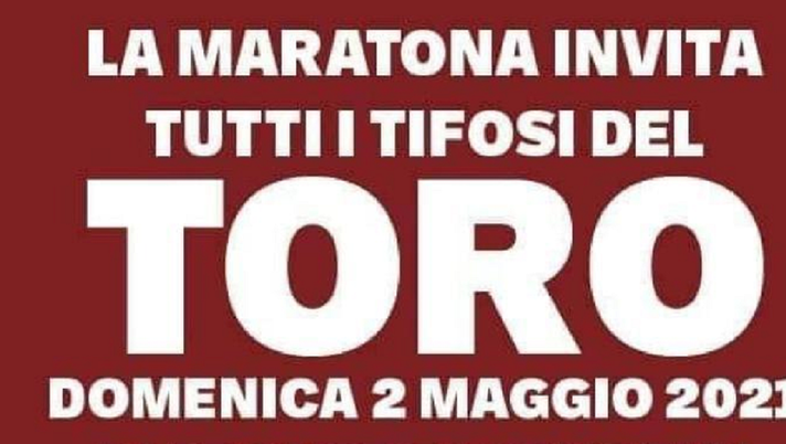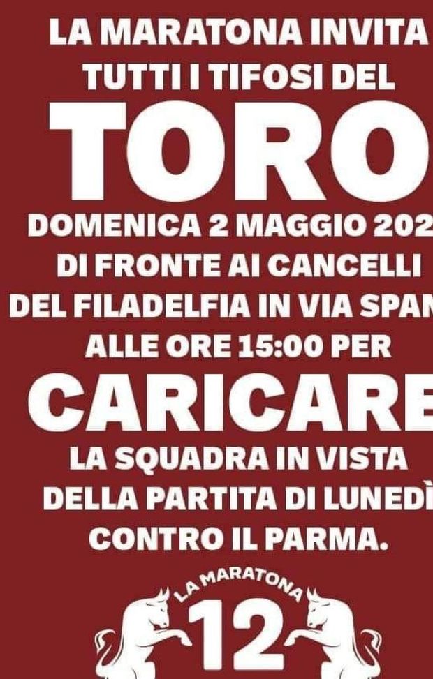"La Maratona invita tutti i tifosi del Toro domenica 2 maggio 2021 di fronte ai cancelli del Filadelfia in via Spano alle ore 15:00 per caricare la squadra in vista della partita di lunedì contro il Parma".