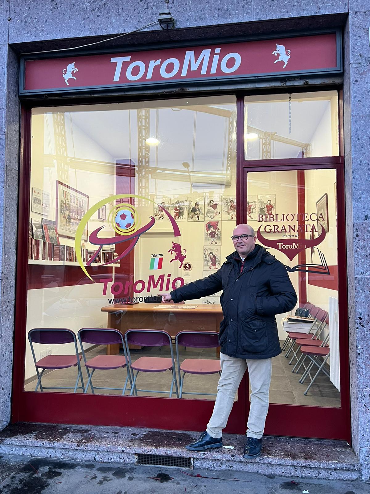 Uno dei luoghi più cari al tifo granata è sicuramente lo Stadio Filadelfia. Per questo ToroMio ha scelto di aprire la sua sede proprio davanti ad uno dei sancta sanctorum del popolo del Toro il giorno del compleanno del club. Il presidente dell'Associazione, l'avvocato Davide Pollano (in foto davanti al locale), ha lasciato queste dichiarazioni a proposito dell'inaugurazione: "Sono molto orgoglioso di questo evento, che va a coronare un percorso che ha visto in questi anni l''Associazione promuovere numerose attività culturali nel mondo granata. Questo luogo sarà un segno tangibile di presenza e di crescita in uno dei luoghi storici della storia del Toro. L'obiettivo è far vivere la sede oltreché nei giorni degli eventi delle partite, anche durante tutta la settimana, e con l'auspicio di creare un punto di aggregazione vero per tutta la tifoseria ". All'evento è prevista la presenza di figure come il nostro Gino Strippoli, Don Riccardo Robella, Ezio Rossi e Franco Ossola.Il locale, tappezzato di foto storiche, ospita la Biblioteca Granata, nata nel 2019 da un'idea di Paolo Cisella come evoluzione del progetto “100 libri per 100 anni” di Sabrina Gonzatto e Giulio Graglia nel 2006, in occasione del Salone del Libro di Torino per il Centenario del Toro. Cisella ha catalogato più di 350 libri in 15 categorie. ToroMio possiede oltre 160 di questi testi e li terrà nella sede di via Filadelfia. Il patrimonio letterario granata è unico al mondo e tra i più copiosi di tutto l'universo calcistico. L'Associazione promuove la cultura legata al mondo Toro e questa ne è l'ennesima testimonianza. Cisella ha commentato così il lavoro svolto: "La biblioteca cartacea è il logico frutto del lavoro di ricerca e catalogazione dei libri granata eseguita e resa accessibile a tutti nel sito web da me costruito da autodidatta e online già dal 2020. Mi auguro sia un luogo dove finalmente in tanti possano toccare con mano, o per meglio dire sfogliare le pagine, la Storia del Toro. Dagli albori del calcio, la fondazione nel 1906 che, mi piace ricordare, è stata possibile dall’unione di soci appassionati con pochi soldi, ma molto attivi; la costruzione del Filadelfia con il primo scudetto, l’epopea degli Invincibili, il travagliato dopo Superga, la creazione del Tremendismo, lo scudetto del ’76 fino alla finale di Amsterdam e ai giorni nostri, passando dalla notte di Bilbao. In ogni biografia, poesia, favola, racconto di fantasia o esperienze reali e raccontate genuinamente da molti tifosi granata che riempiono i testi che potrete consultare, troverete i valori autentici che costituiscono le fondamenta dell’Identità e Fratellanza Granata!".