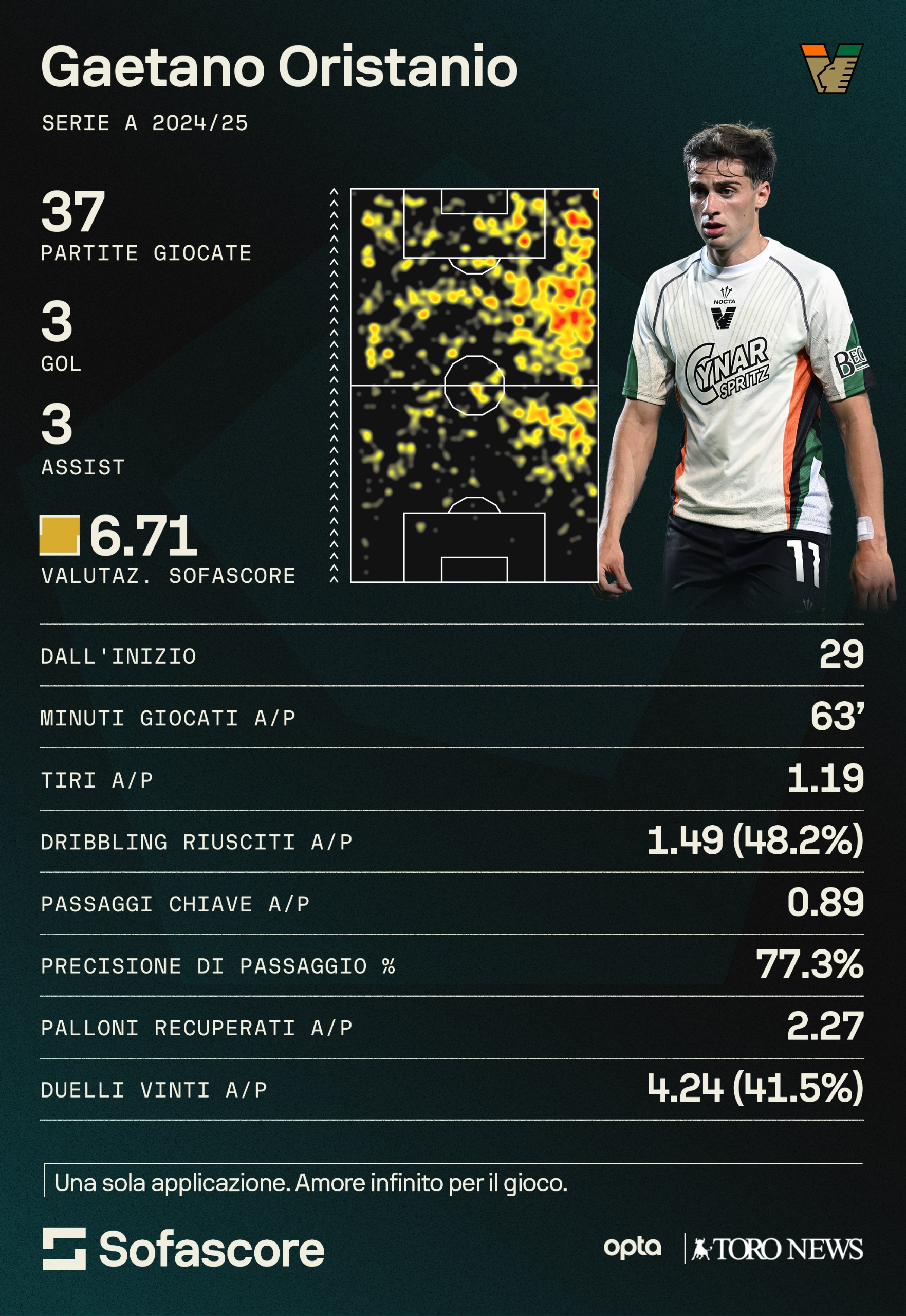 L'ultimo nome ad essere entrato nell'elenco degli obiettivi di Davide Vagnati - secondo quanto riportato da Alfredo Pedullà - è quello di Gaetano Oristanio. Il trequartista classe 2002 è stato uno dei migliori giocatori del Venezia nell'ultimo campionato di Serie A e difficilmente resterà ancora in laguna dopo la retrocessione arrivata a fine maggio. Oristanio si è messo molto in mostra soprattutto per una caratteristica in particolare: quella del dribbling. L'ex Inter è infatti risultato essere uno dei primi in Serie A per qualità nei dribbling e, come evidenziato dai dati raccolti da Sofascore, ha completato 1,49 dribbling a partita in media. Si tratta di un valore non banale e che potrebbe certamente far comodo ad una squadra come il Toro che ha pochi specialisti in questo fondamentale.
