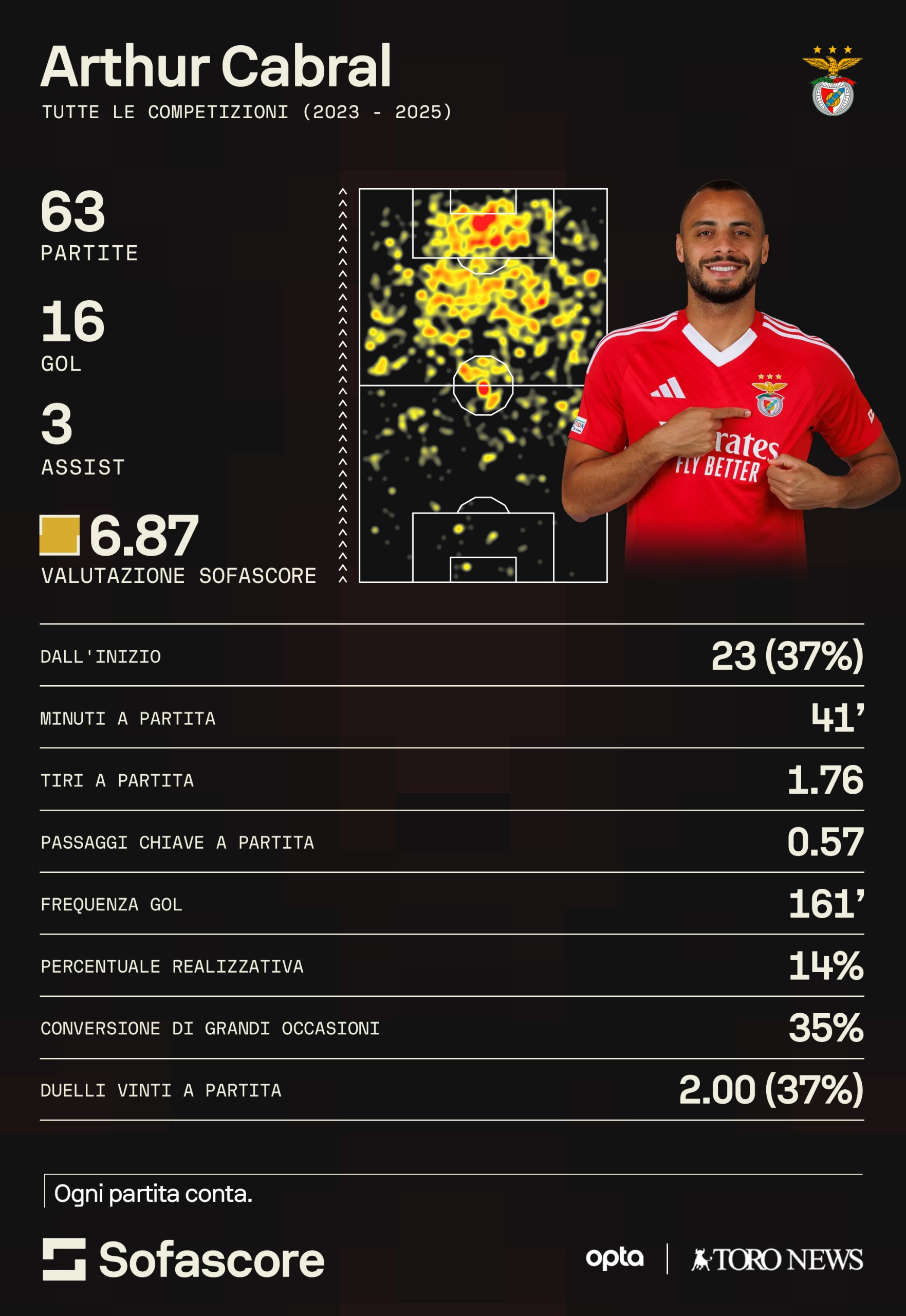 Come ogni buon brasiliano il suo idolo non può che essere Ronaldo il fenomeno, mentre la fonte di ispirazione è Hulk, attaccante connazionale al quale somiglia come struttura e qualità. Con in mente i consigli di papà Helio, che lo ha cresciuto a pane e calcio, Cabral nell'agosto del 2019 si trasferisce in Svizzera. Nonostante l'impatto, che fu "scioccante", come dichiarato in un'intervista data la differenza di temperatura, di stile di vita e di concezione del calcio rispetto al Brasile, l'attaccante non ci mette molto ad ambientarsi. Nella sua prima stagione mette a segno 14 reti, che salgono poi a 20 nella seconda (20/21). Ma la vera esplosione arriverà nella stagione seguente, maglia numero 10 sulle spalle e arriva ad uno score incredibile: 29 gol e 10 assist, di cui 12 in 13 partite di Conference League, guadagnandosi anche la sua prima e fin qui unica chiamata in nazionale maggiore. Nel gennaio 2022 ecco che si trasferisce alla Fiorentina, la viola versa nelle casse del Basilea 16 milioni di euro, e il brasiliano si prende sulle spalle la 9 di Vlahovic, da poco ceduto alla Juventus. In Italia vive un periodo di alti e bassi e in 64 presenze colleziona 19 gol e 4 assist, senza lasciare il segno. Quando la Fiorentina vede l'occasione di cederlo e di fare anche plusvalenza non esita e nell'agosto 2023 l'attaccante passa al Benfica, dove milita attualmente, ma senza trovare grande spazio. In Portogallo ha fin qui collezionato 63 presenze, con 16 gol e 3 assist a referto. Ha una media di 41 minuti a partita e di un gol ogni 161'. Di seguito i dati.© RIPRODUZIONE RISERVATA