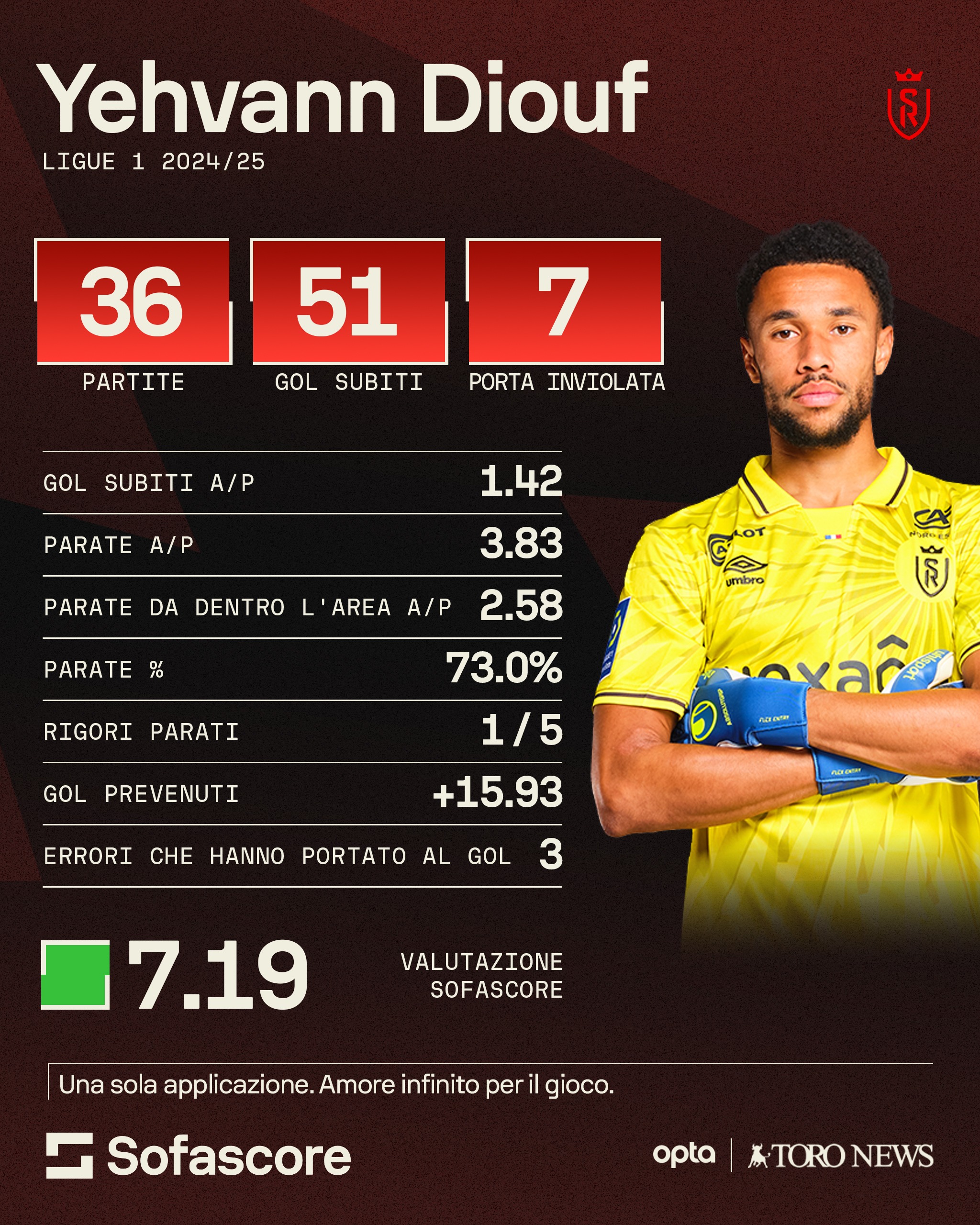 La notizia arriva dalla Francia e viene rilanciata da Footmercato: il Torino sarebbe tra le squadre interessate a Yehvann Diouf come nuovo portiere. Si tratta di un calciatore classe 1999 che negli ultimi sei anni ha sempre indossato la divisa dello Stade Reims. Quest'anno però per il club francese in cui gioca è arrivata una triste retrocessione nello spareggio salvezza contro il Metz, dopo che ha concluso il campionato al 16° e terzultimo posto della classifica di Ligue 1. Sebbene sia nato in Francia - e abbia sempre giocato nelle nazionali transalpine giovanili -, Diouf ha scelto di prendere parte alla nazionale senegalese maggiore, con la quale ha debuttato lo scorso 6 giugno nell'amichevole contro l'Irlanda. Nell'ultima stagione l'estremo difensore che piace al Torino ha aiutato la sua squadra anche a raggiungere la finale di Coppa di Francia, perdendo però poi la finale contro il PSG. Dal punto di vista personale per Diouf è stata una stagione caratterizzata da 58 gol incassati in 41 gare giocate in tutte le competizioni e si contano 7 gare con la porta inviolata in campionato in 36 presenze (compresi i due match spareggio). Come evidenziano i dati di Sofascore, Diouf ha saputo parare un rigore sui 5 fronteggiati in stagione con una buona percentuale del 73% di parate compiute ma anche tre errori decisivi che hanno portato ad una rete subita.