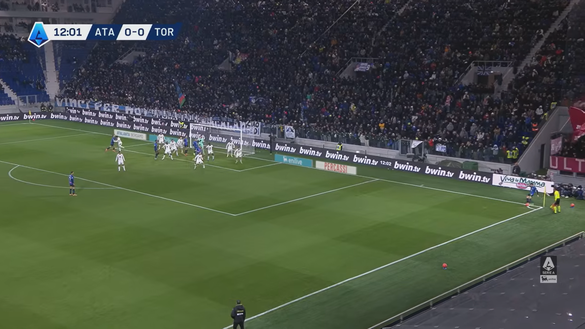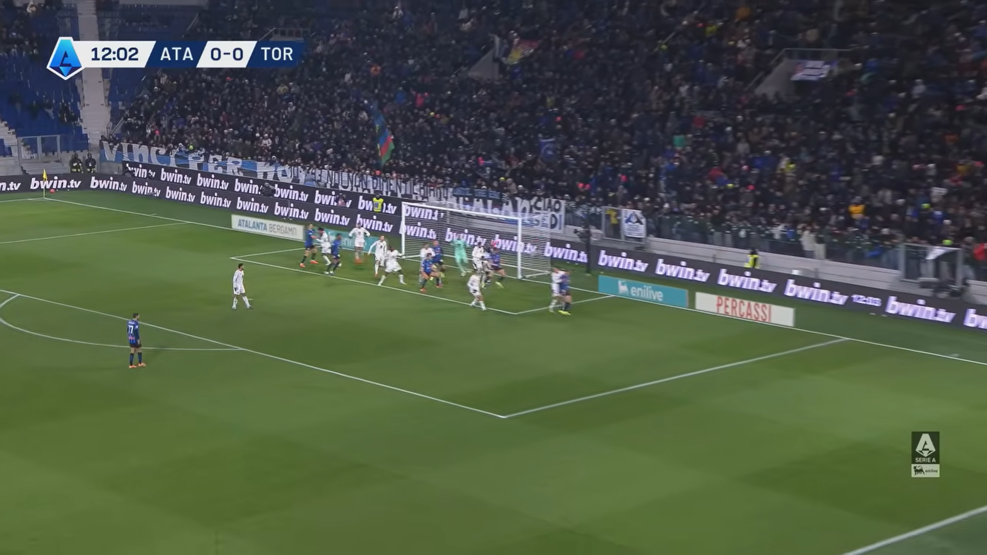Il Toro passa in svantaggio al 13' minuto del primo tempo, per via di un calcio d'angolo che favorisce l'Atalanta. Come si nota nell'immagine 1, dalla bandierina destra è Bernasconi a incaricarsi della battuta di questo corner e calcia il pallone con il suo mancino, a giro verso il centro dell'area.