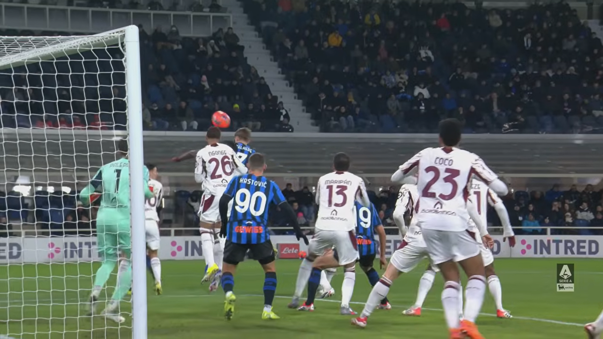 Come si può notare nell'immagine 3, i primi che cercano di intervenire su questo traversone sono stati Ngonge e Zapata che erano i difendenti più vicini al trequartista della Dea. Tuttavia, le due punte del Torino sono state poco reattive e non si sono mosse con i giusti tempi per anticipare o comunque contrastare efficacemente De Ketelaere. A rimarcarlo è stato anche Baroni che dopo la partita ha ammesso: "Stiamo lavorando, c'è un po' di passività e anche col Cagliari abbiamo subito un gol simile. Vedo spuntare Zapata e Ngonge che sicuramente dovevano attaccare questa palla con più determinazione e convinzione".