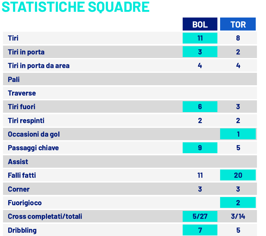 Match bloccato e poco brillante sotto porta: Bologna 11 tiri, Torino 8, con 3 vs 2 nello specchio. Skorupski quasi inoperoso (2 parate), Paleari leggermenter più sollecitato (3 parate). I rossoblù hanno spinto soprattutto dai lati (27 cross totali, 5 riusciti) senza sfondare; il Toro ha creato meno volume (14 cross, 3 riusciti) e ha avuto un’unica, vera palla nitida con Adams. Qui sta il margine citato da Baroni: arrivare meglio sull’ultimo passaggio e finalizzare.L’atteggiamento delle due squadre