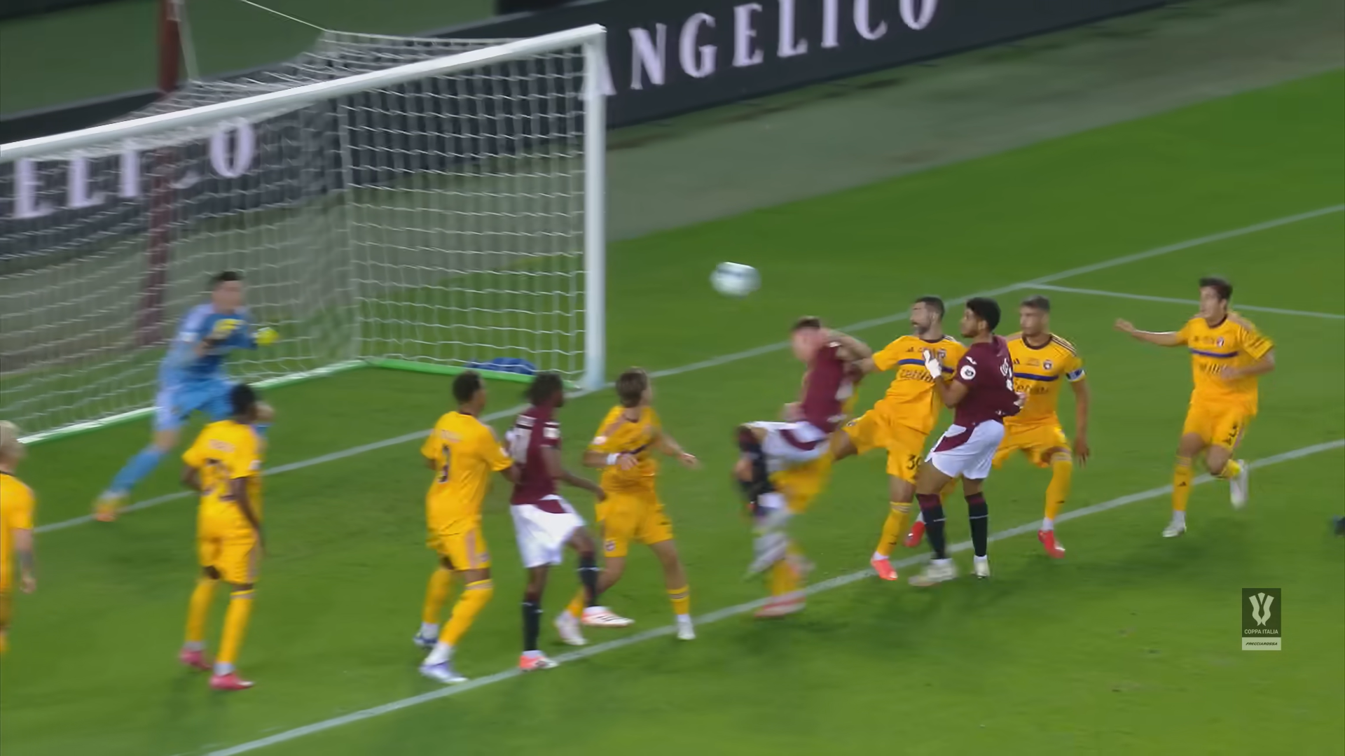 Nell'immagine 2, essendo più lontani, si vede come il giocatore del Torino sia in cielo e quasi incontrastato dal suo marcatore che non è riuscito nemmeno a saltare venendo ostacolato anche dal resto della mischia. Il movimento di Casadei è stato quindi perfetto per inserirsi verso il primo palo e raccogliere il buon cross battuto da Ngonge sul corner. Gilardino si è infatti detto rammaricato per questo gol subito, visto che ritiene che i suoi giocatori abbiano disputato una buona prestazione, il tecnico ex Genoa probabilmente è conscio del fatto che la sua difesa avrebbe potuto fare un lavoro migliore in marcatura su questo corner del primo tempo per evitare che il Toro si portasse in vantaggio subito a inizio gara e si prendesse il pass per gli ottavi di Coppa Italia.