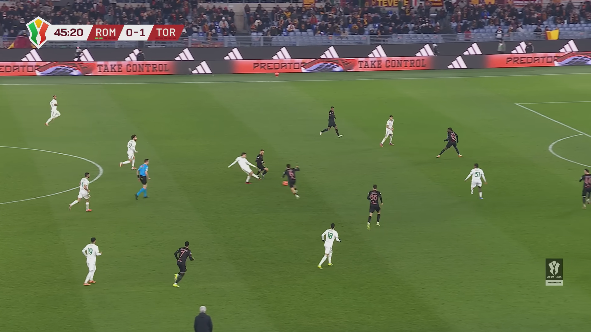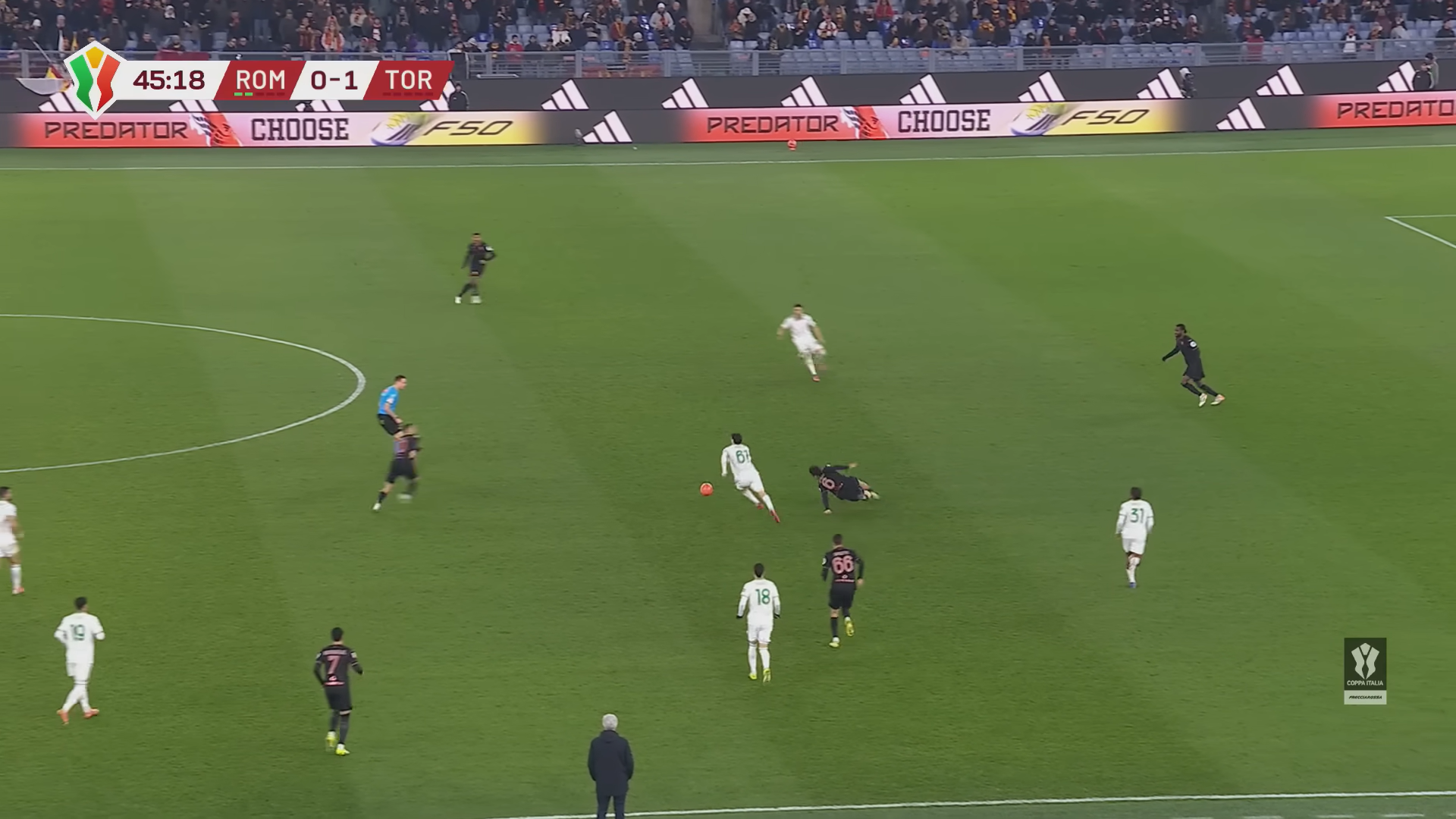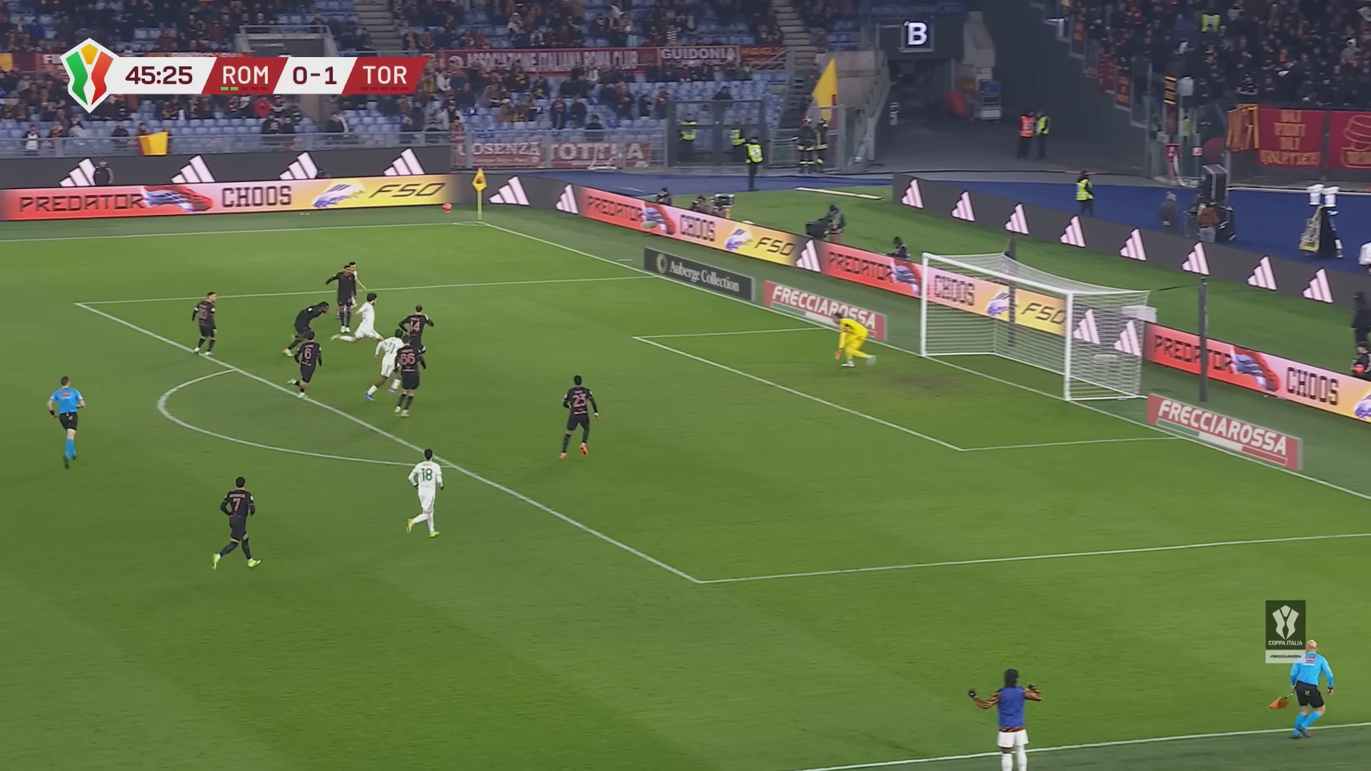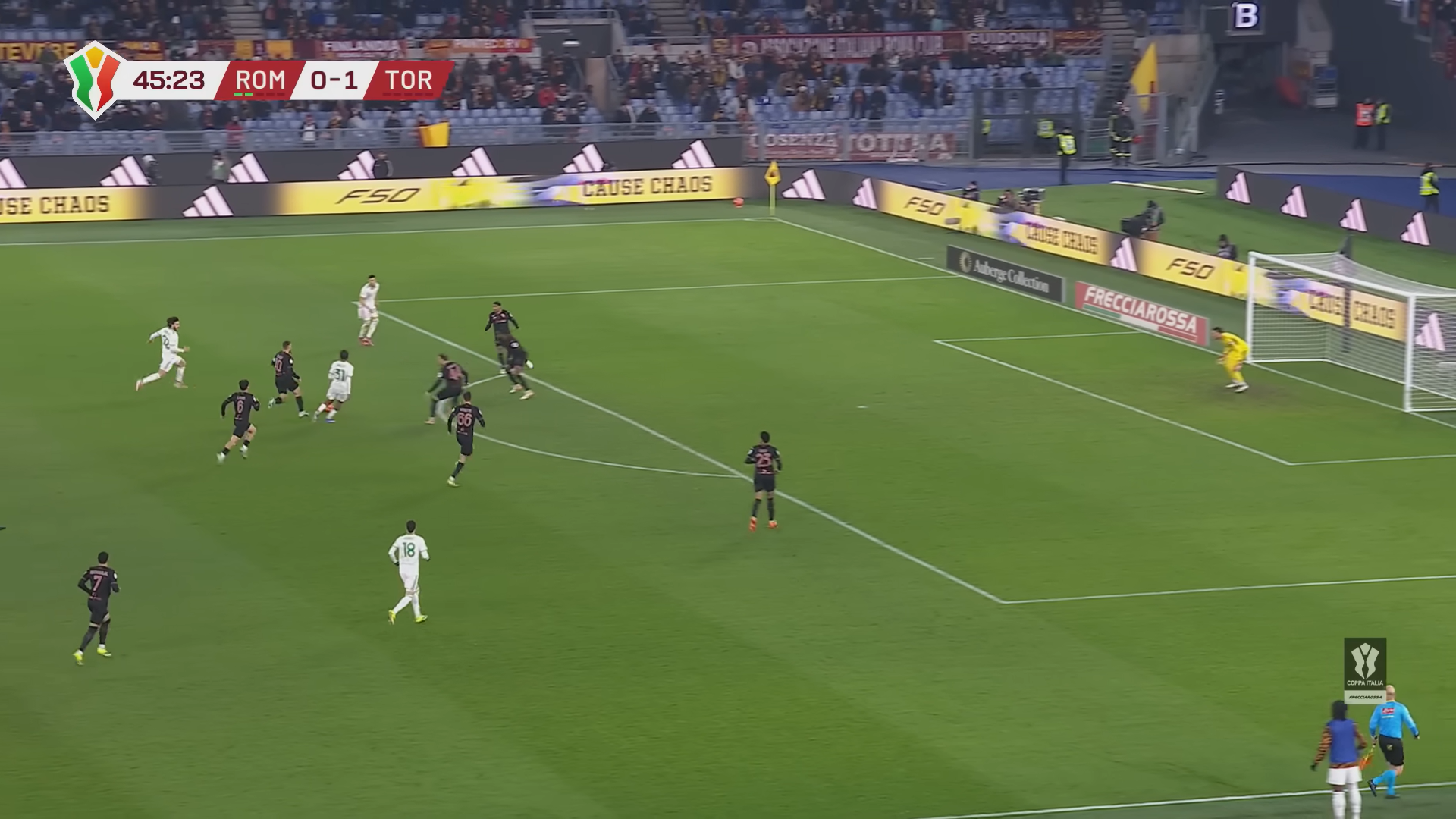 Il calciatore spagnolo fa poi una giocata che non si vede spesso fare ai difensori. Passa in mezzo a tre uomini del Torino facendo persino un tunnel ai danni di Tameze e poi calcia col mancino incrociando perfettamente sul secondo palo (immagine 5). Paleari non può nulla su questo tiro molto preciso e così dopo meno di 30 secondi dall'inizio del secondo tempo, la Roma ha ritrovato il pareggio.