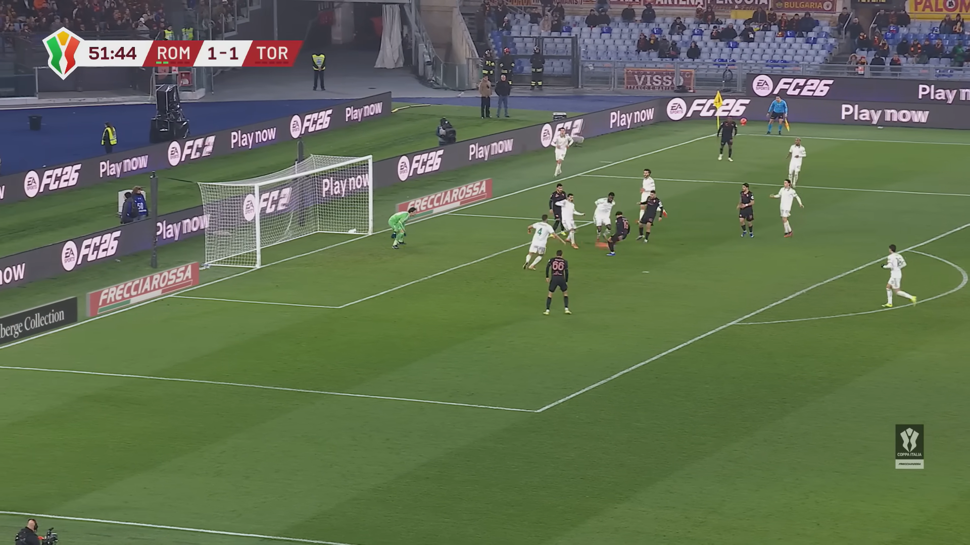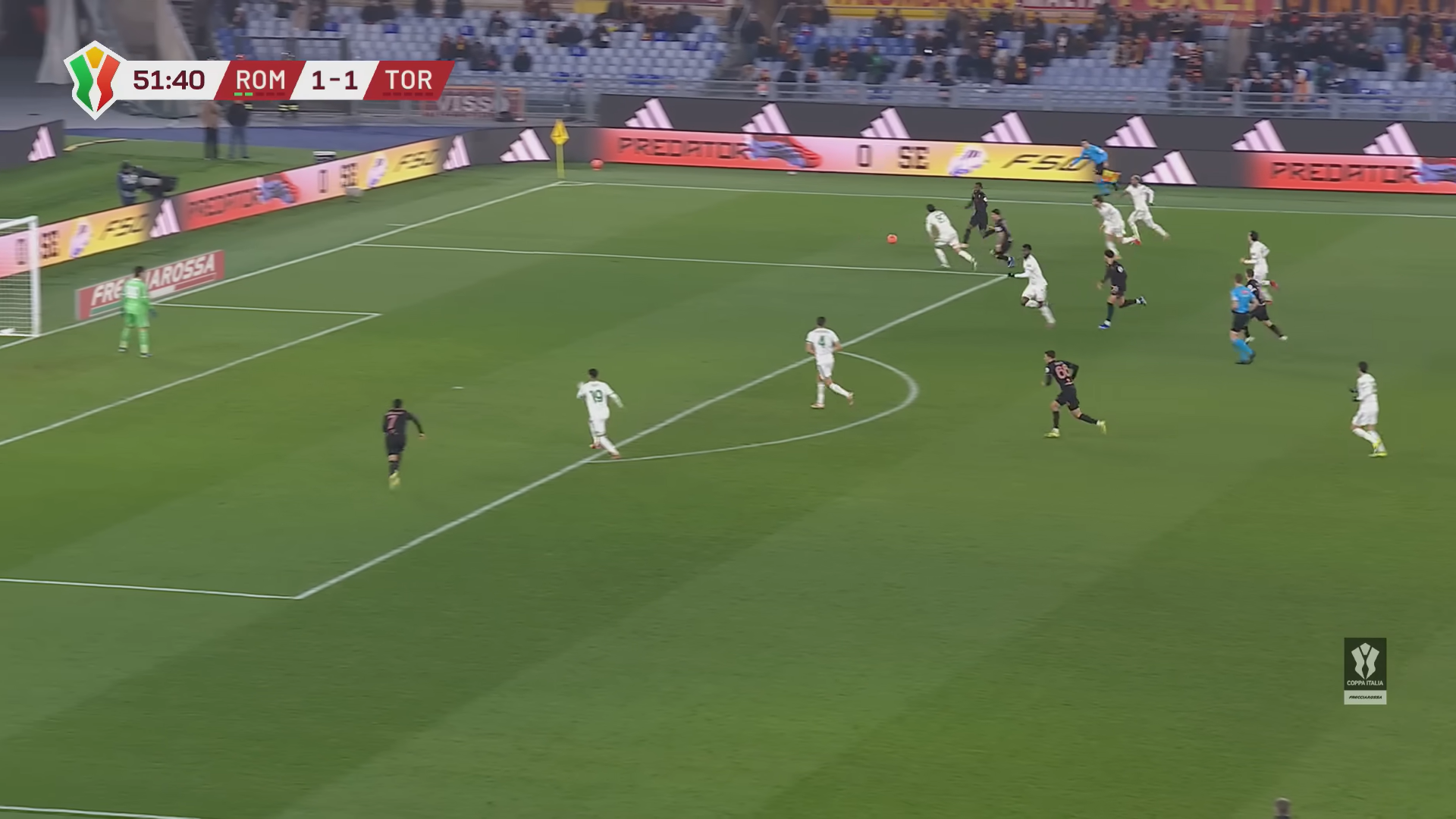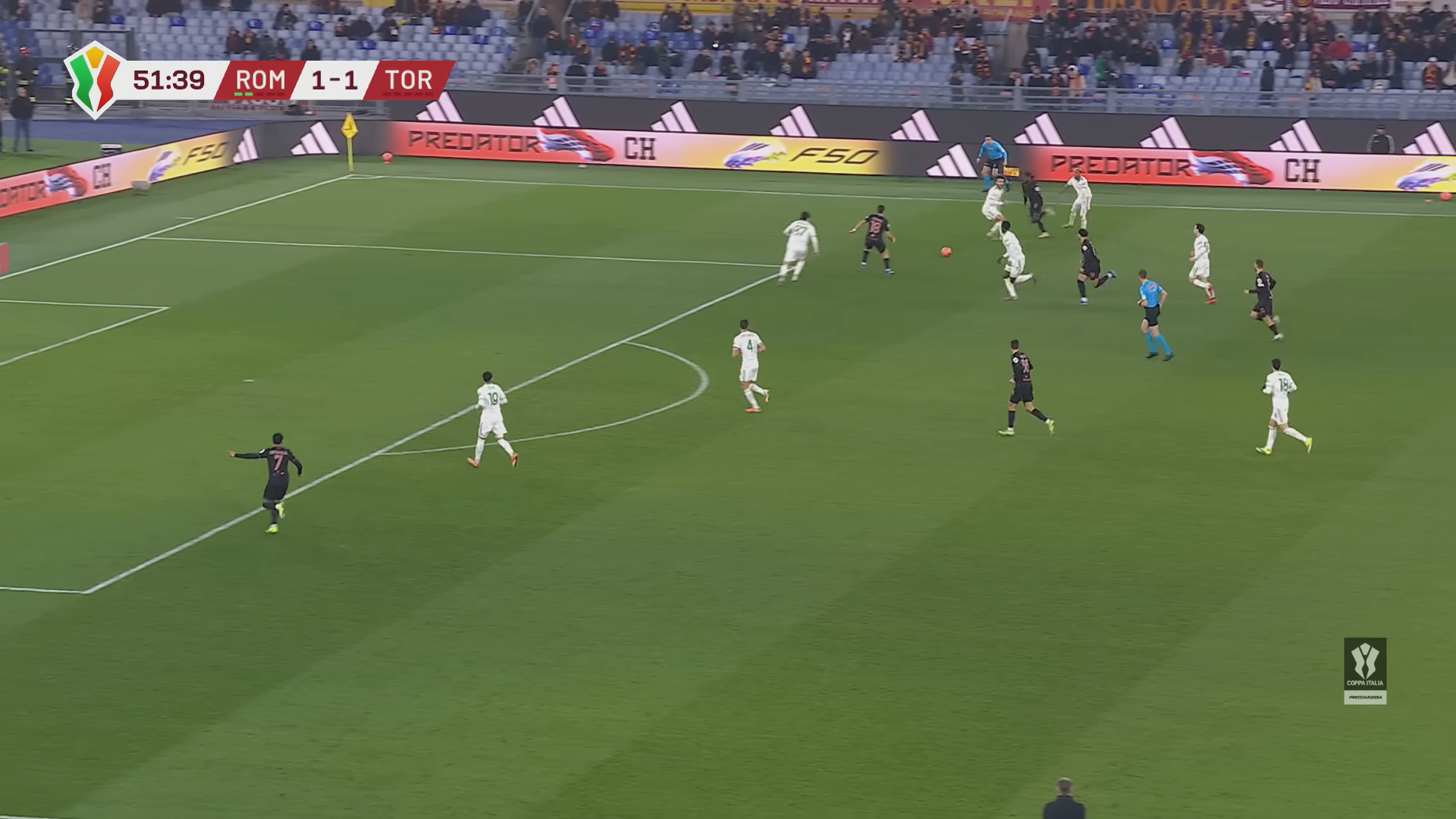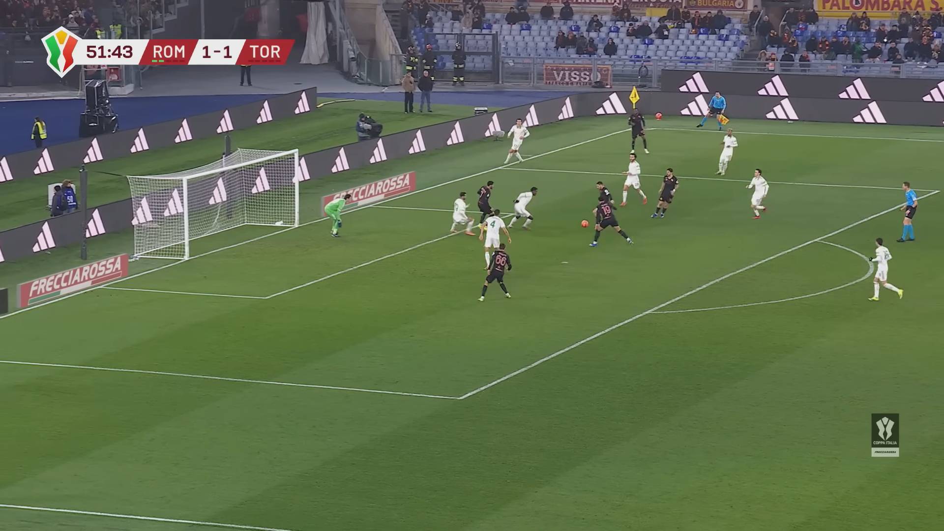 Il numero 10 croato fa il suo secondo assist di serata appoggiando la palla per Adams che, come si nota nell'immagine 4, ha un ottimo spazio davanti a lui e calcia con forza. Il tiro centrale del numero 19 del Toro non è perfetto e infatti Svilar lo tocca ma senza trattenere la palla. Il portiere della Roma forse avrebbe potuto fare meglio e infatti si dispera dopo aver concesso il gol.