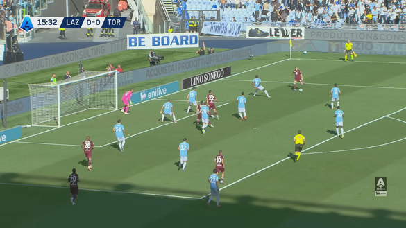 Il Toro passa in vantaggio di nuovo allo stadio Olimpico di Roma (in nessun'altra gara di Serie A è successo fin qui) con la firma di Simeone che segna di nuovo nello stadio della capitale e lo fa al 16'. Come si vede nell'immagine 1, il primo a dare benzina all'azione offensiva è Vlasic che crossa dalla sinistra un pallone verso il secondo palo.