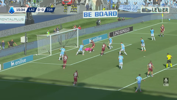 La fortuna del Toro in questa circostanza è che Provedel non è efficace nell'intervento e sbaglia la respinta lasciando la palla in pieno nell'area piccola dove c'è Simeone tutto solo (immagine 3).