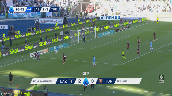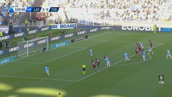 Nell'immagine 3 si vede il contatto falloso di Coco che, disperato, travolge Noslin indirizzato verso la porta. Forse il centrale granata avrebbe potuto temporeggiare vista la posizione defilata dell'attaccante laziale però in quel momento trovare lucidità non sarà certamente stato semplice, dopo l'erroraccio di Dembelé.