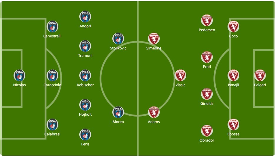 PISA (3-5-2): Nicolas; Canestrelli, Caracciolo, Calabresi; Angori, Tramoni, Aebischer, Hojholt, Leris; Stojlkovic, Moreo. A disposizione: Semper, Scuffet, Bozhinov, Coppola, Albiol, Cuadrado, Loyola, Touré, Akinsanmiro, Piccinini, Bettazzi, Stengs, Meister. Allenatore: Hljemark.TORINO (3-4-1-2): Paleari; Coco, Ismajli, Ebosse; Pedersen, Prati, Gineitis, Obrador; Vlasic; Simeone, Adams. A disposizione: Israel, Siviero, Marianucci, Maripan, Lazaro, Tameze, Ilkhan, Casadei, Ilic, Anjorin, Biraghi, Nkounkou, Njie, Kulenovic. Allenatore: D'Aversa