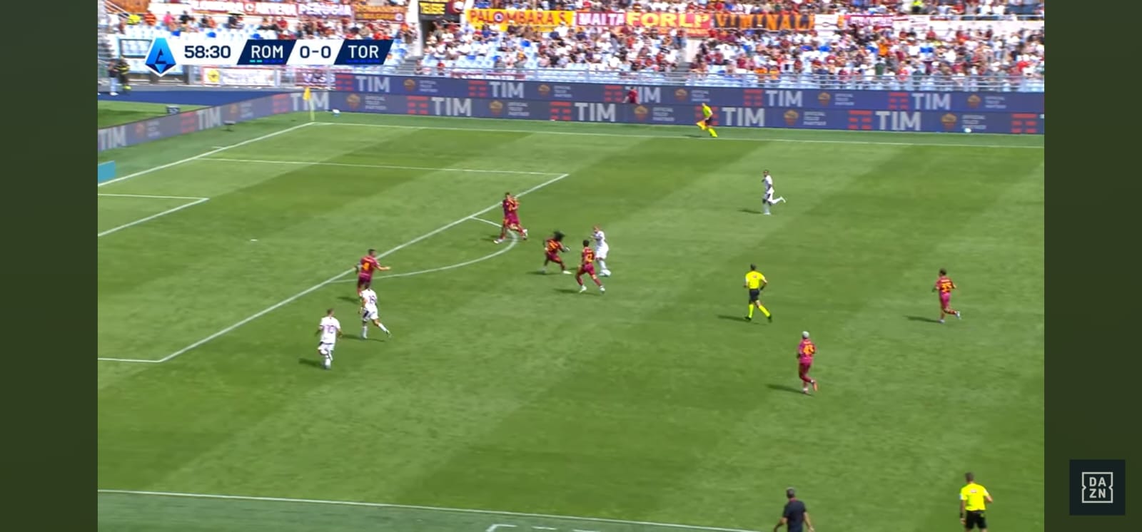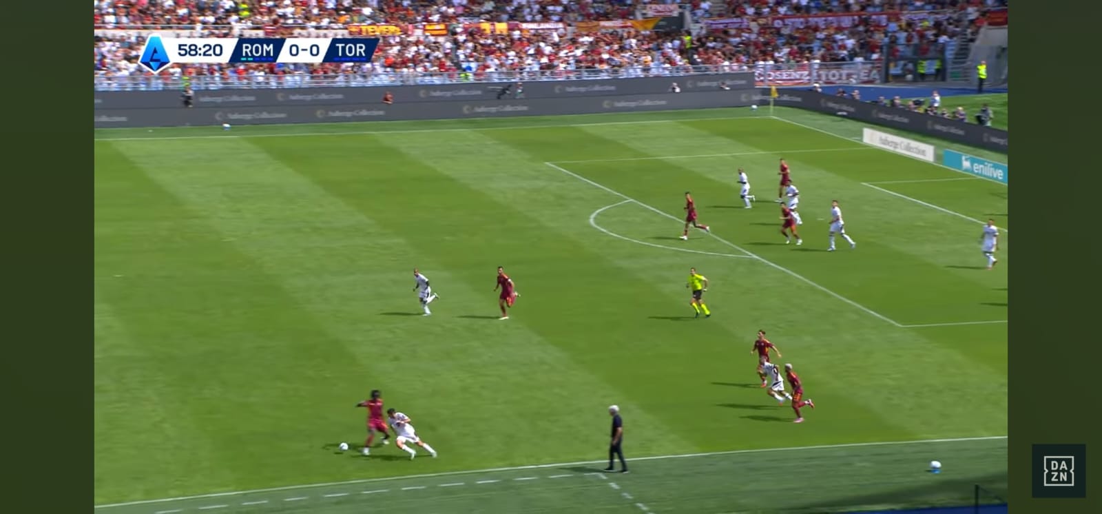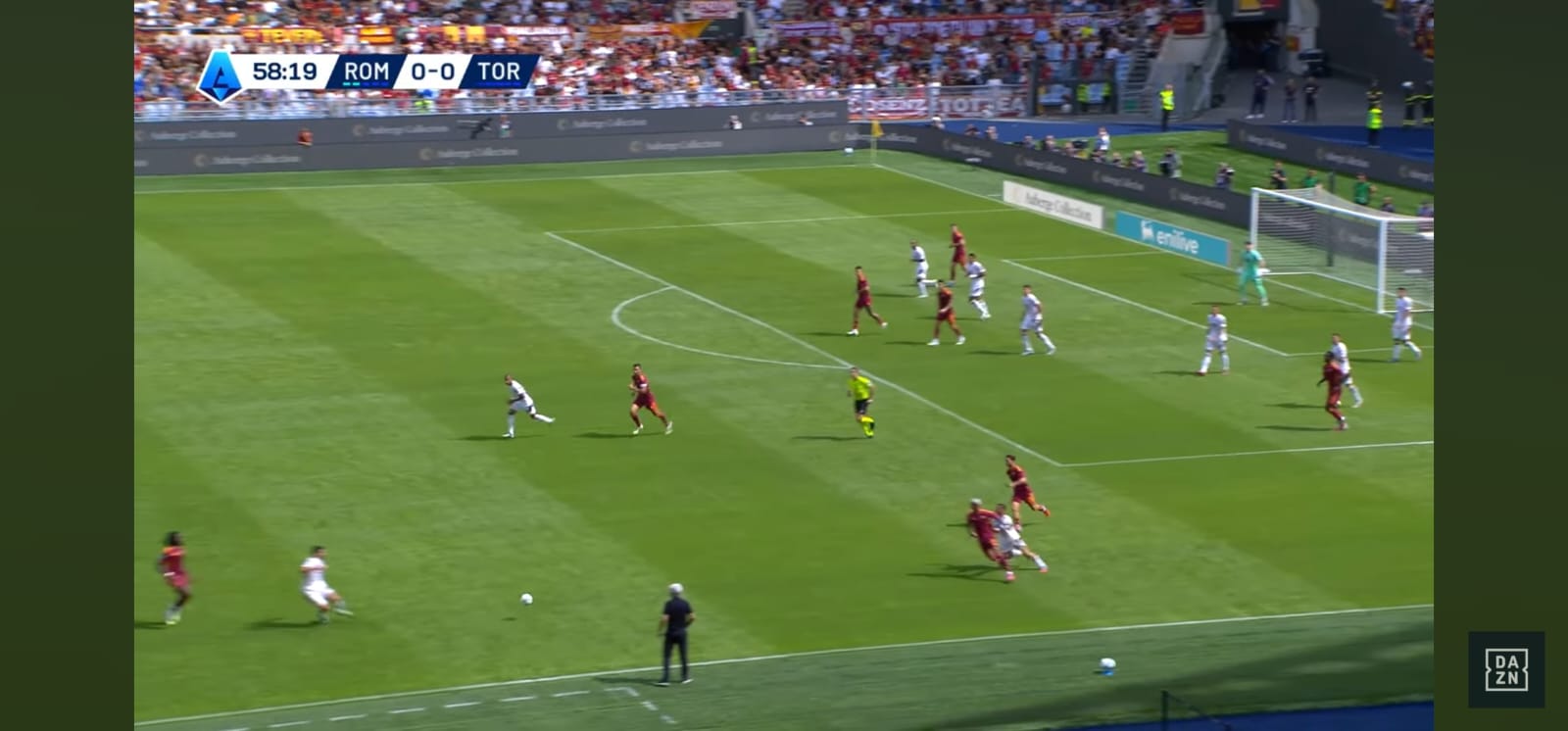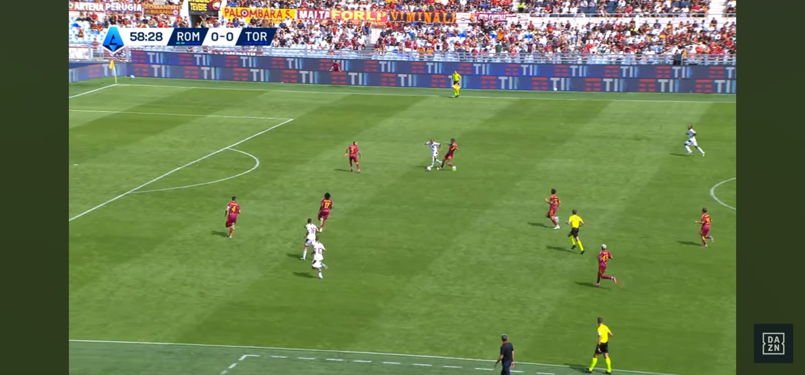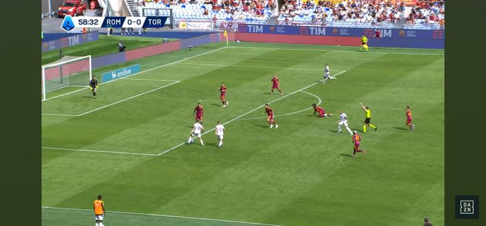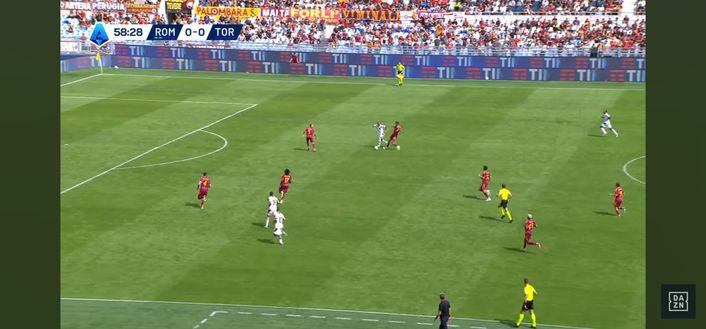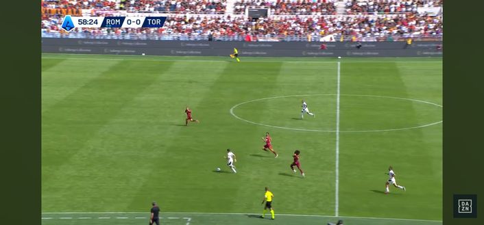 Allora la scelta perfetta dell'argentino: sterza, disorienta Cristante e riesce a servire con un leggerissimo tocco sotto Ngonge dall'altra parte. Il belga è bravo a controllare il pallone (Immagine 4) e guardare verso il centro del campo.