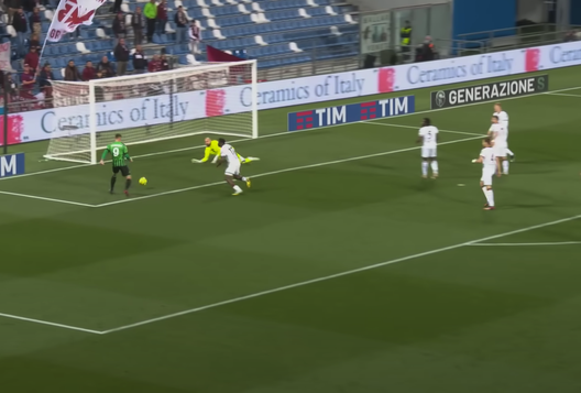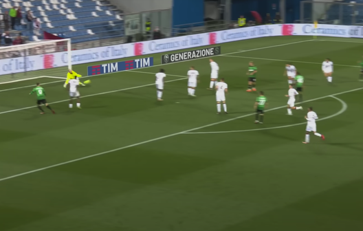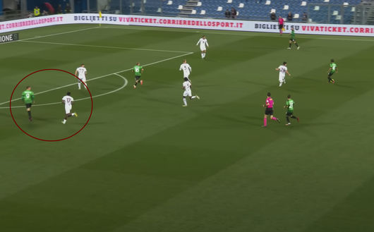 Berardi punta Rodriguez nell'uno contro uno, mentre Singo va a riprendere la sua posizione, ma sembra curarsi più della palla. Il difensore, infatti, non guarda mai Pinamonti.