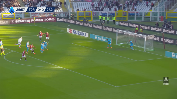 Il Torino si porta in vantaggio al 27' grazie a un recupero palla poco prima del centrocampo con Tameze che anticipa Gaetano e poi lascia ad Asllani. Come si nota nell'immagine 1, Adams resiste al contrasto portato dai giocatori del Cagliari che cercavano di riprendersi la sfera proprio sulla linea mediana del campo. Dopo questo contrasto però il pallone arriva tra i piedi di Gineitis che imbuca molto bene e trova un bel passaggio filtrante.