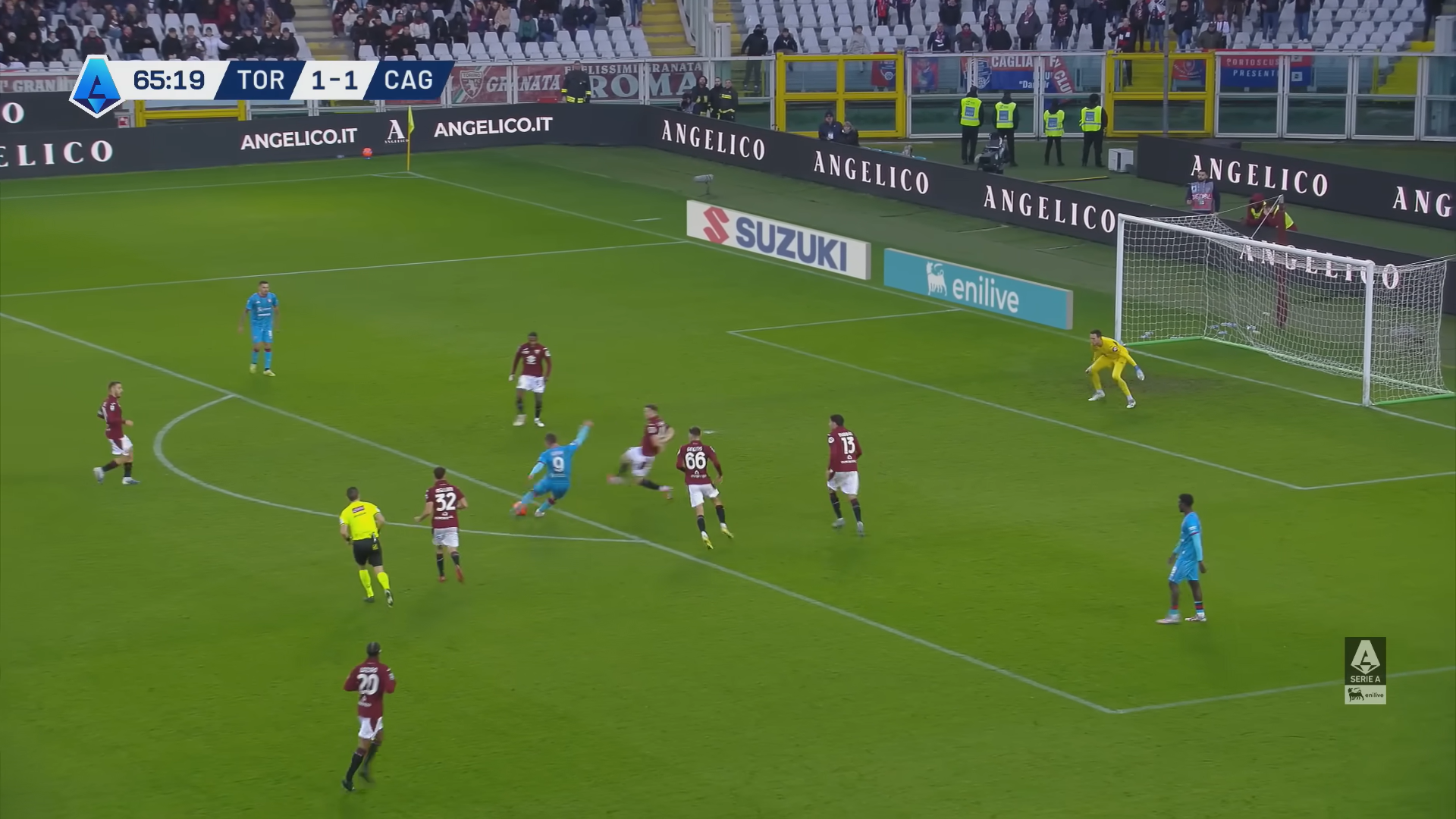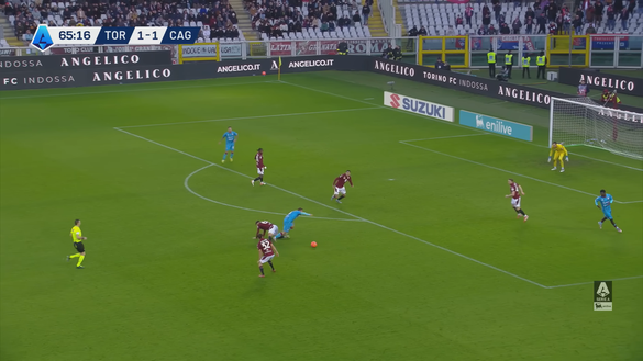 Il numero del Cagliari viene così attaccato da altri difendenti granata e il primo che gli si frappone è Maripan. Anche il difensore cileno però non riesce a fermarlo e così Kilicsoy si sposta sul mancino - che è bene ricordare non sia il suo piede forte - per far partire dal limite dell'area una conclusione perfetta che si insacca a fil di palo alla destra di Paleari. Anche la disperata scivolata di Ismajli, che si nota nell'immagine 4, non è bastata per impedire al turco di realizzare una rete molto bella che al 66' ha fissato il punteggio sull'1-2 finale.