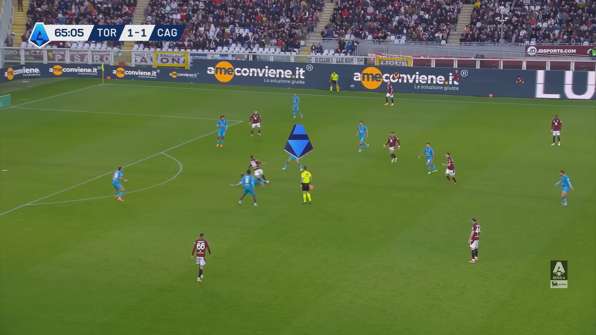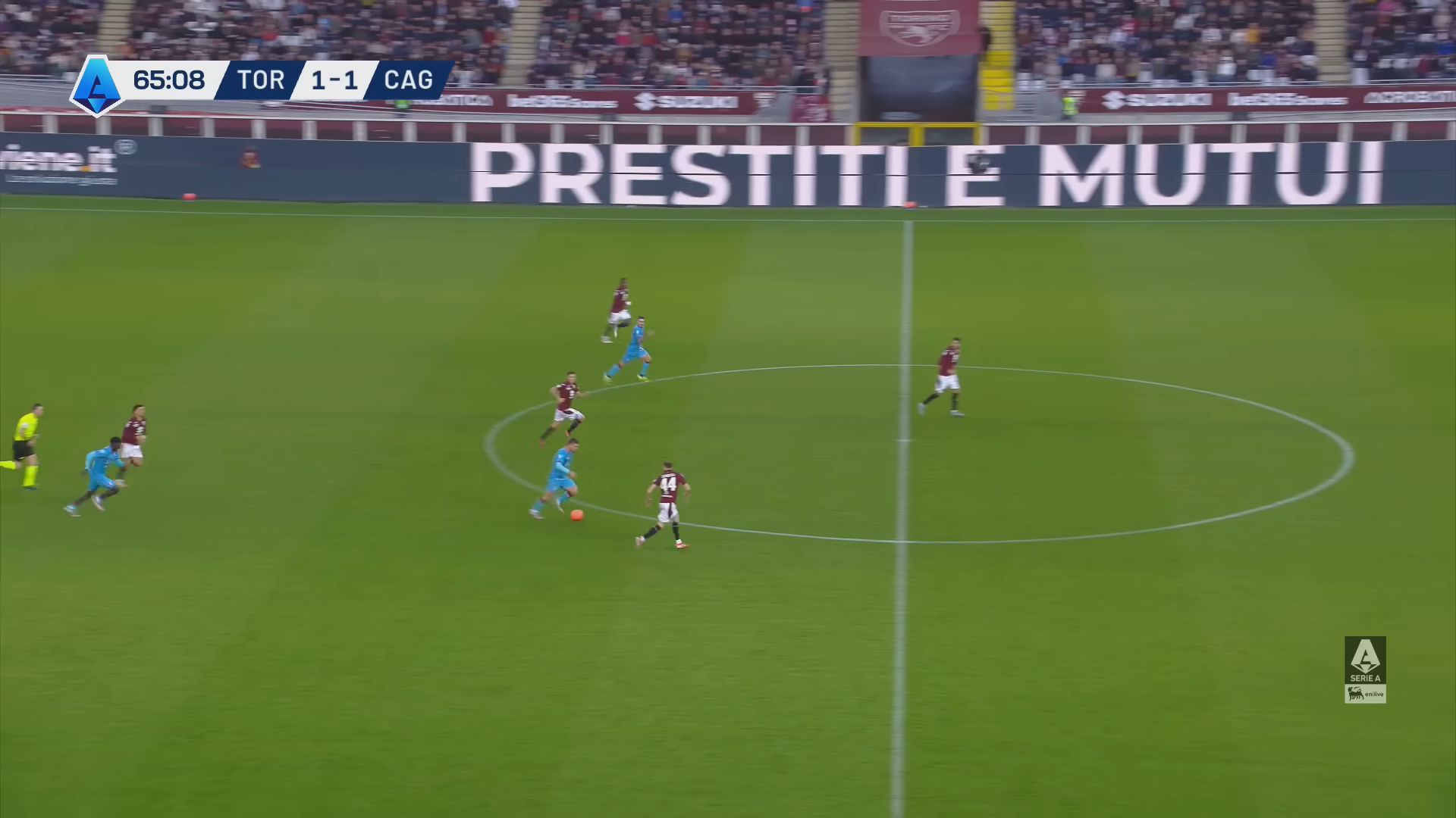 La sfera termina tra i piedi di Kilicsoy che la riceve molto prima della linea di metà campo e che è comunque ben marcato dai difensori del Toro che sono in superiorità numerica evidente, come si vede nell'immagine 2.