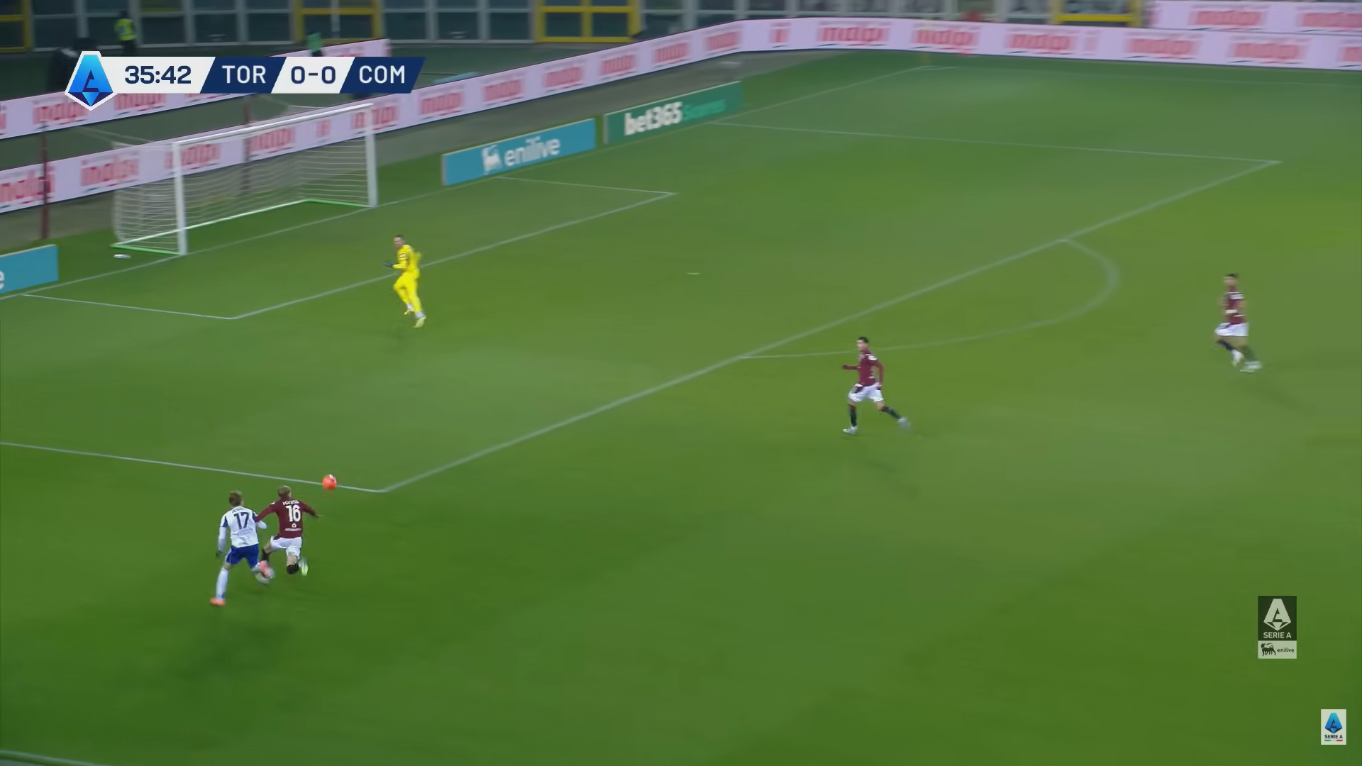 Tuttavia, il numero 16 del Toro è poi troppo morbido in un secondo momento e dopo un contrasto si fa superare dall'attaccante del Como. Nell'immagine 3 si nota il momento in cui Pedersen sbaglia la posizione del corpo e viene ormai tagliato fuori dall'avversario, con Rodriguez che è ormai già indirizzato e partito verso la porta di Paleari.