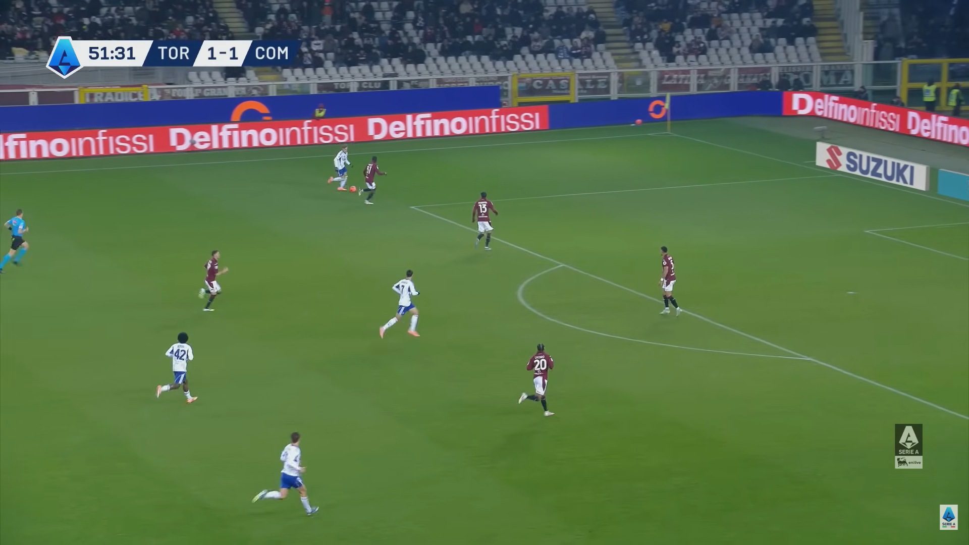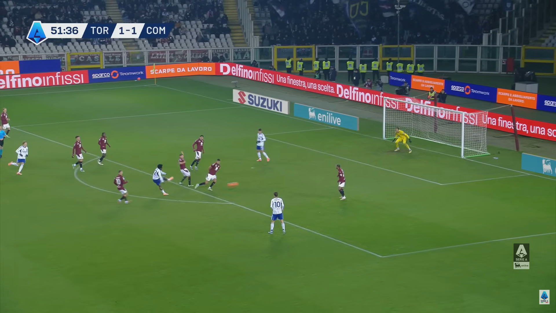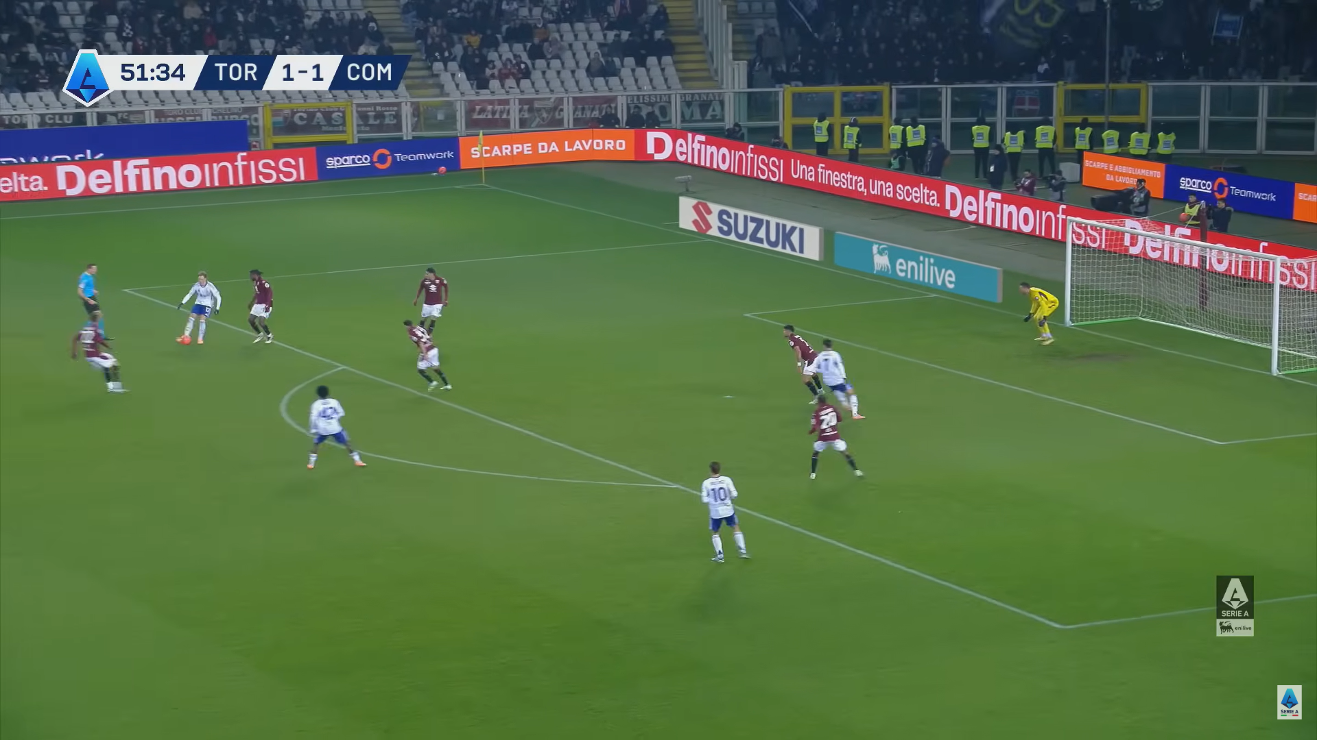 La difesa del Toro non chiude con il tempismo giusto su Addai e gli lascia molto spazio. Il talento del Como non se lo fa dire due volte, prende la mira e calcia con precisione battendo Paleari con una bella conclusione a fil di palo che il portiere granata tocca soltanto e così Torino-Como passa sull'1-2 al 52' ed è di nuovo a favore dei lombardi in termini di punteggio.