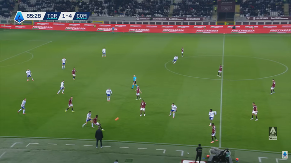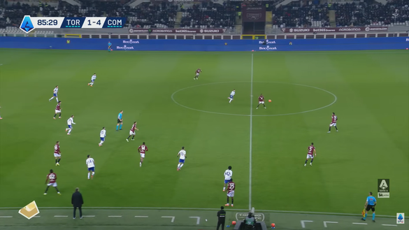 A completare la serata degli errori del Torino ci pensa un altro subentrato come Njie che all'86' minuto - trovatosi chiuso e senza spazio per attaccare - torna indietro spalle alla porta. Decide però di fare un passaggio molto pericoloso verso la sua difesa ma sono sbagliati sia la misura che il concetto (immagine 1).