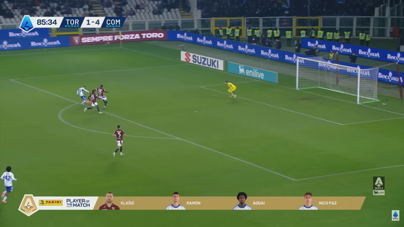 Si tratta di Baturina che parte molto rapidamente in avanti e si presenta davanti a Paleari avendo il tempo di prendere bene la mira. A nulla serve il rientro di Maripan sul giocatore numero 20 del Como perché ormai la conclusione è già partita e batte anche il portiere granata. Torino-Como termina così sull'1-5 ed è una lezione di calcio molto pesante per il Toro di Baroni che subisce un pesante ko di fronte al proprio pubblico al termine di una partita piena zeppa di errori in difesa da parte di tantissimi singoli dei granata.
