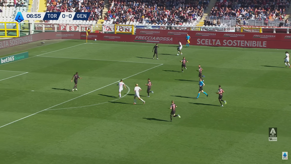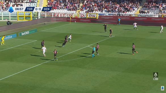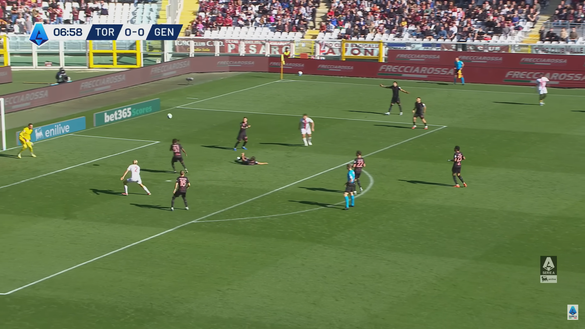 Il pallone messo in mezzo dall'attaccante del Genoa non era affatto pericoloso o insidioso per la retroguardia del Toro che era anche in superiorità numerica con 4 uomini a difendere contro i soli due giocatori rossoblù che tentavano l'offensiva nell'area di Paleari. Nell'immagine 2 si può notare come il pallone lento e spiovente stesse arrivano nella zona di Asllani.