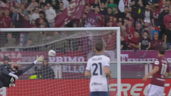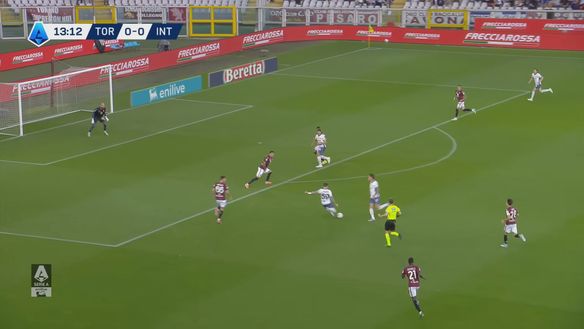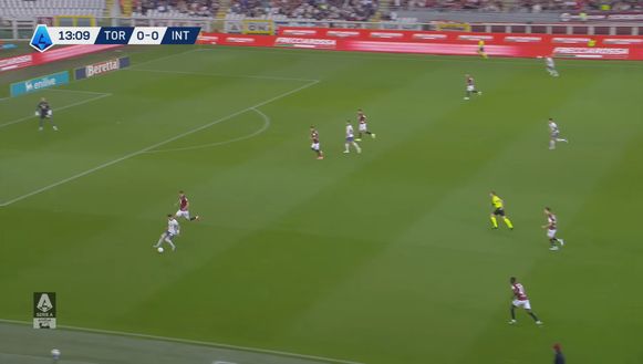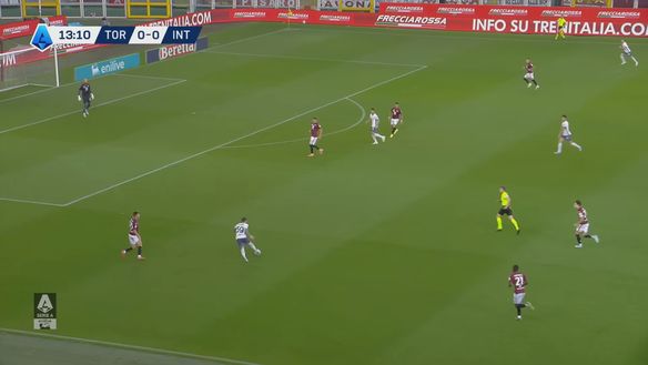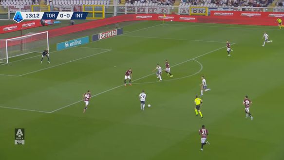 Il polacco può progredire indisturbato verso il centro del campo. Il granata più prossimo a lui è Maripan, che potrebbe accorciare. Tuttavia, il cileno, anziché attaccare Zalewski in modo da impedirgli il tiro arretra, lasciando all'ex Roma piena visibilità verso la porta granata.