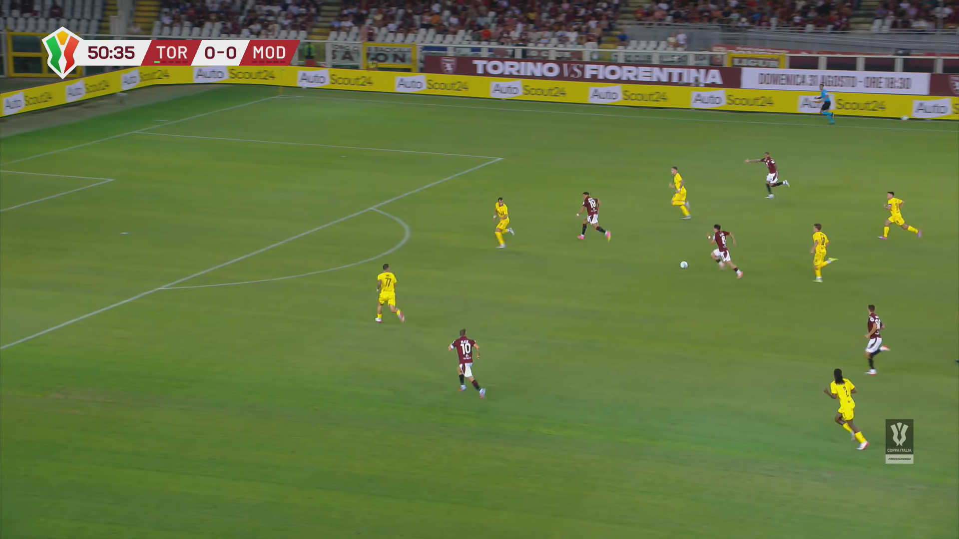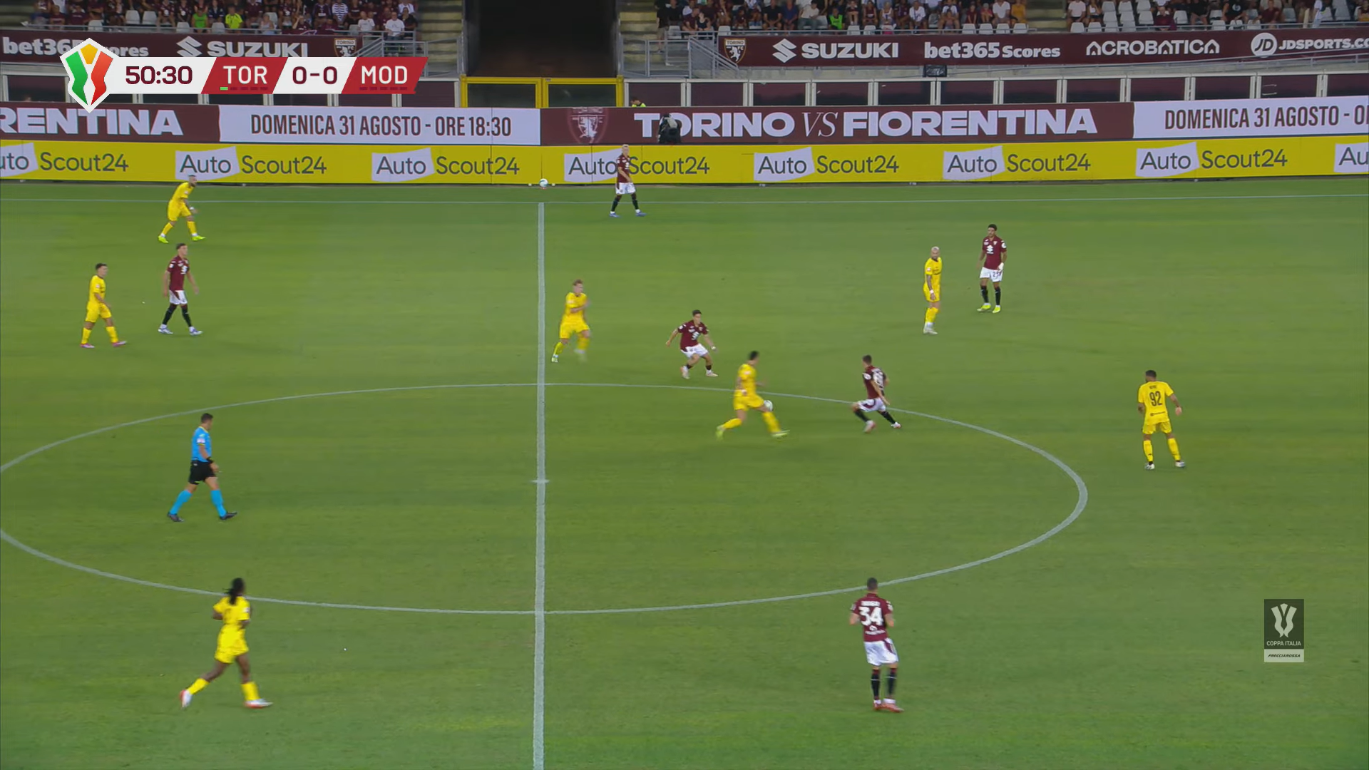 L'azione che porta al vantaggio del Torino nasce da un recupero palla e da una fase di palleggio nella metà campo difensiva. Come si nota nell'immagine 1, è Ilkhan che piazza l'accelerata decisiva per ribaltare l'azione da una posizione difensiva a un attacco pericoloso. Il numero 6 granata riceve palla da Gineitis che si trova vicino a lui, subito dietro la linea di metà campo e con un cambio di passo improvviso elude il pressing dei giocatori del Modena.