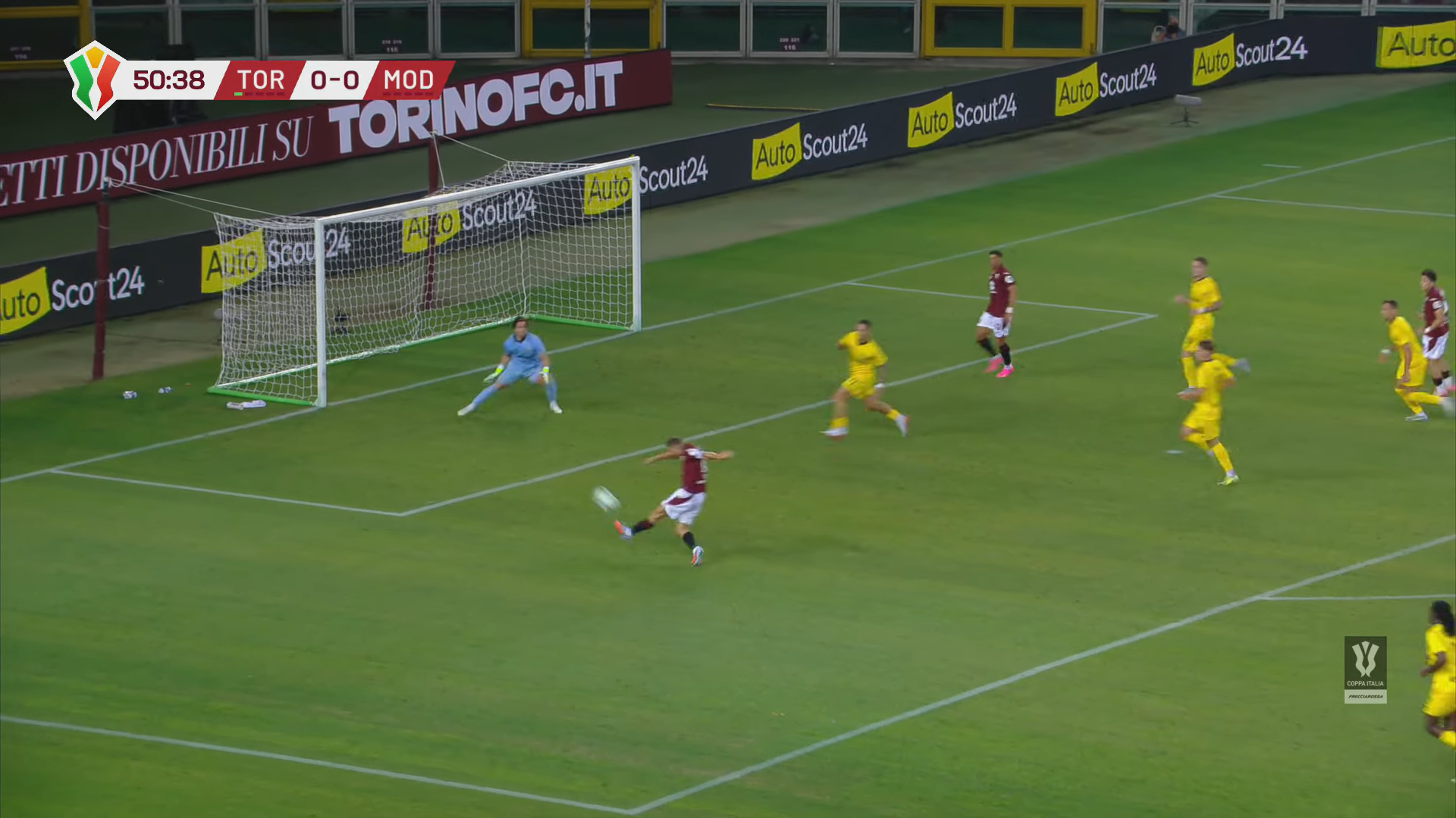 Appena arriva proprio al limite dell'area di rigore (immagine 4), Ilkhan fa partire una conclusione potente e rasoterra ma non troppo angolata. Il portiere del Modena riesce infatti a tuffarsi con il tempismo giusto. Chichizola para infatti il tiro del centrocampista classe 2004 del Toro ma non lo fa al meglio e la palla rimane ancora a disposizione degli attaccanti granata che ne approfittano nel modo giusto.