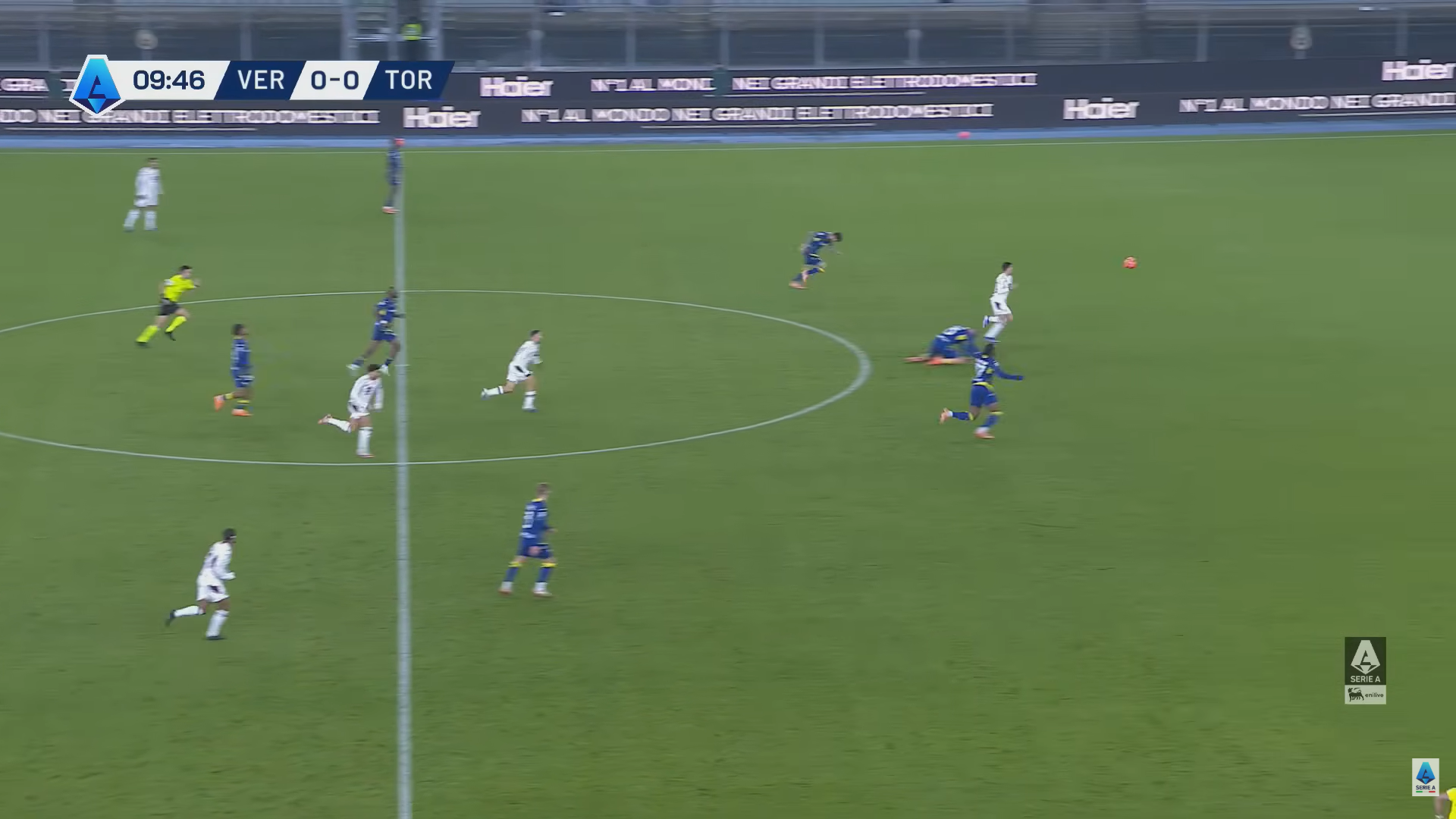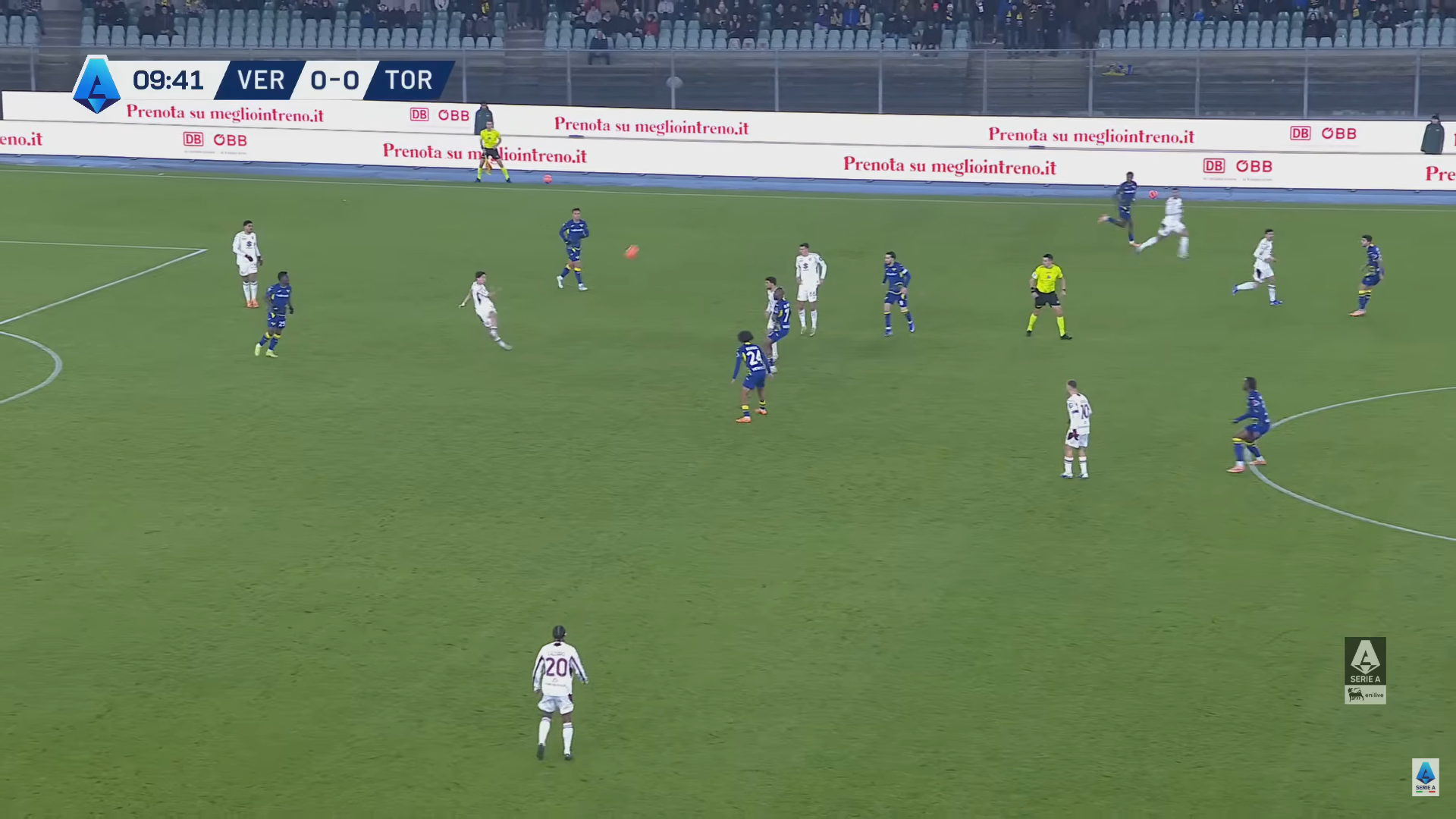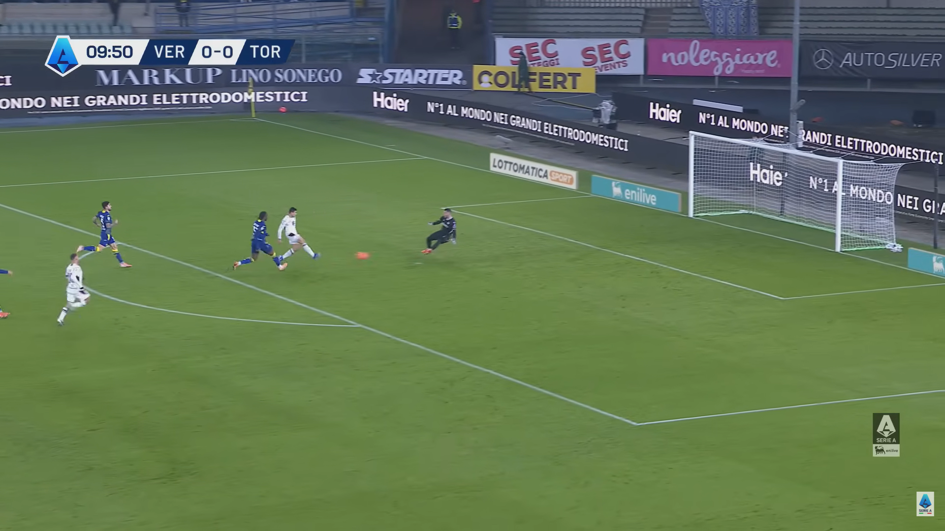 Il primo a intervenire è Bella Kotchap che di testa prova ad allontanare la sfera e trova Bernede. Il numero 24 gialloblù però sbaglia tutto e tenta un retropassaggio che però supera i suoi compagni e dona una chance enorme al Toro (immagine 2).