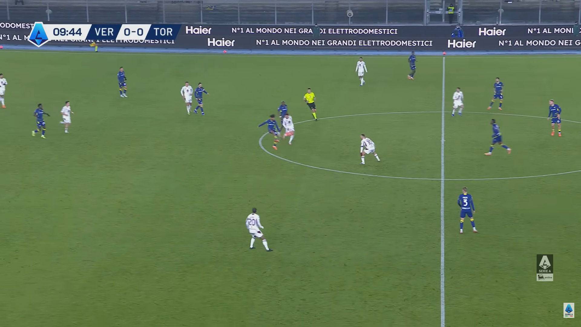 L'avvio di gara del Torino è subito su ritmi alti con tanto pressing e diversi tiri verso la porta di Montipò fin dal primo minuto di gioco. I granata riescono a capitalizzare un'occasione preziosa al minuto 10 quando si portano in vantaggio grazie al gol dell'ex, Simeone. Come si vede nell'immagine 1, tutto nasce dalle retrovie con Ilkhan che fa un lancio lungo e alto verso il centrocampo.