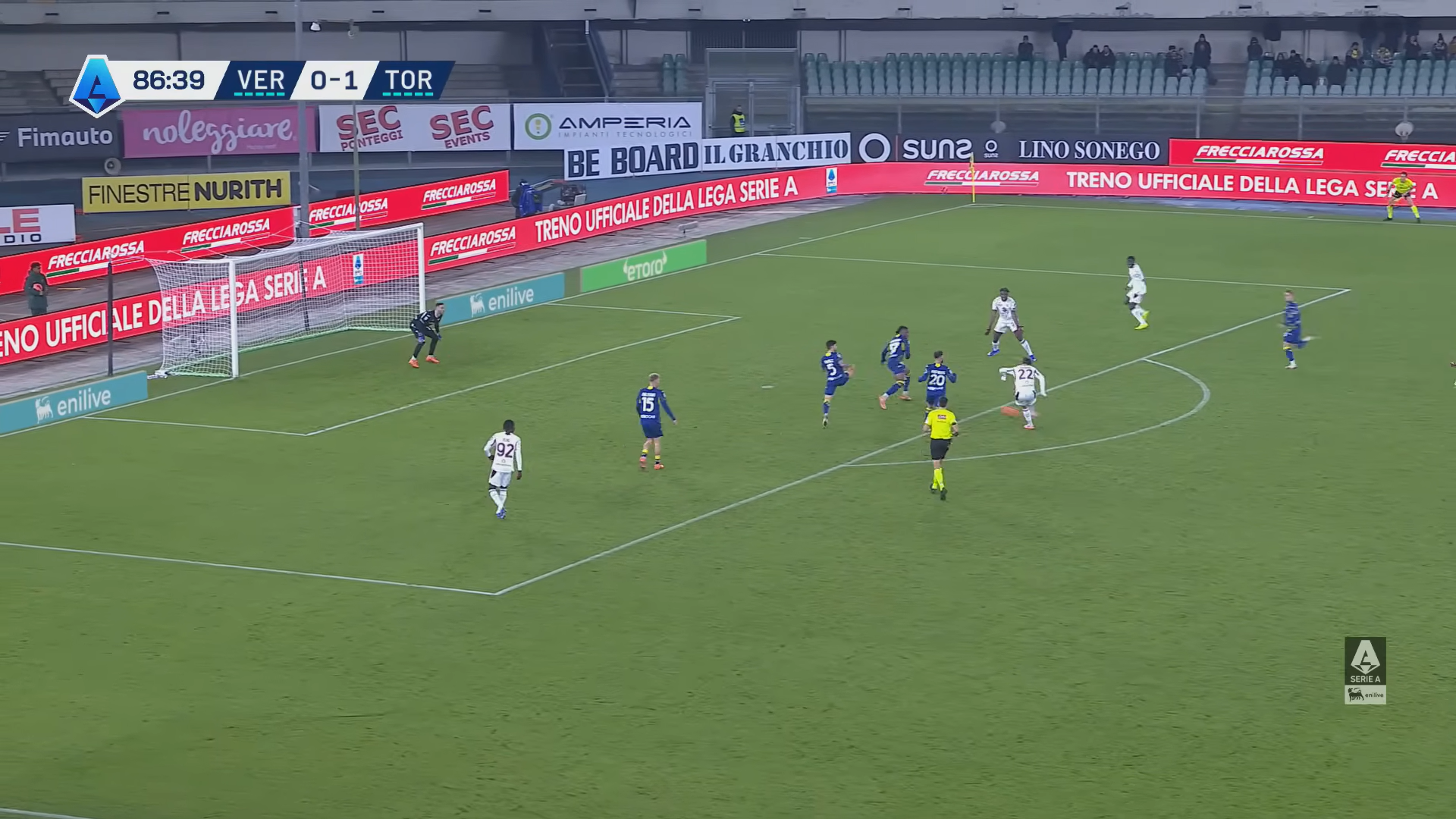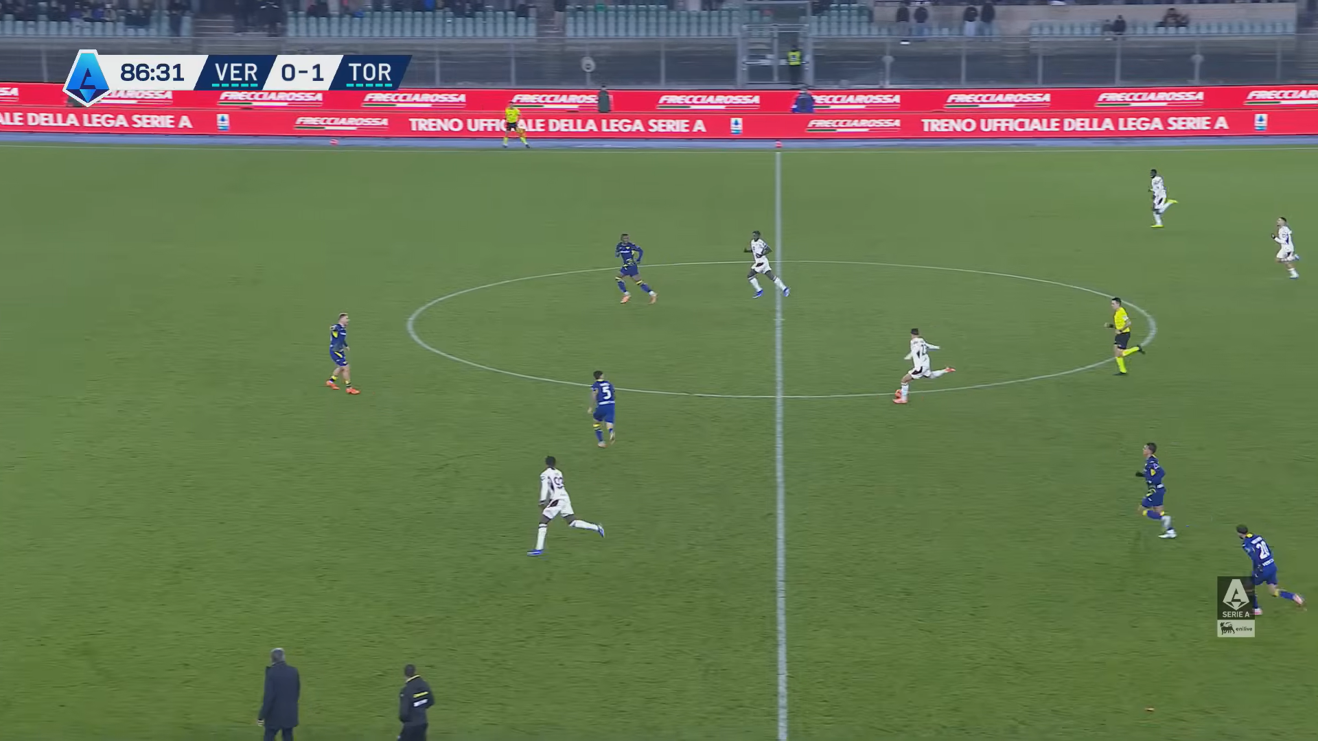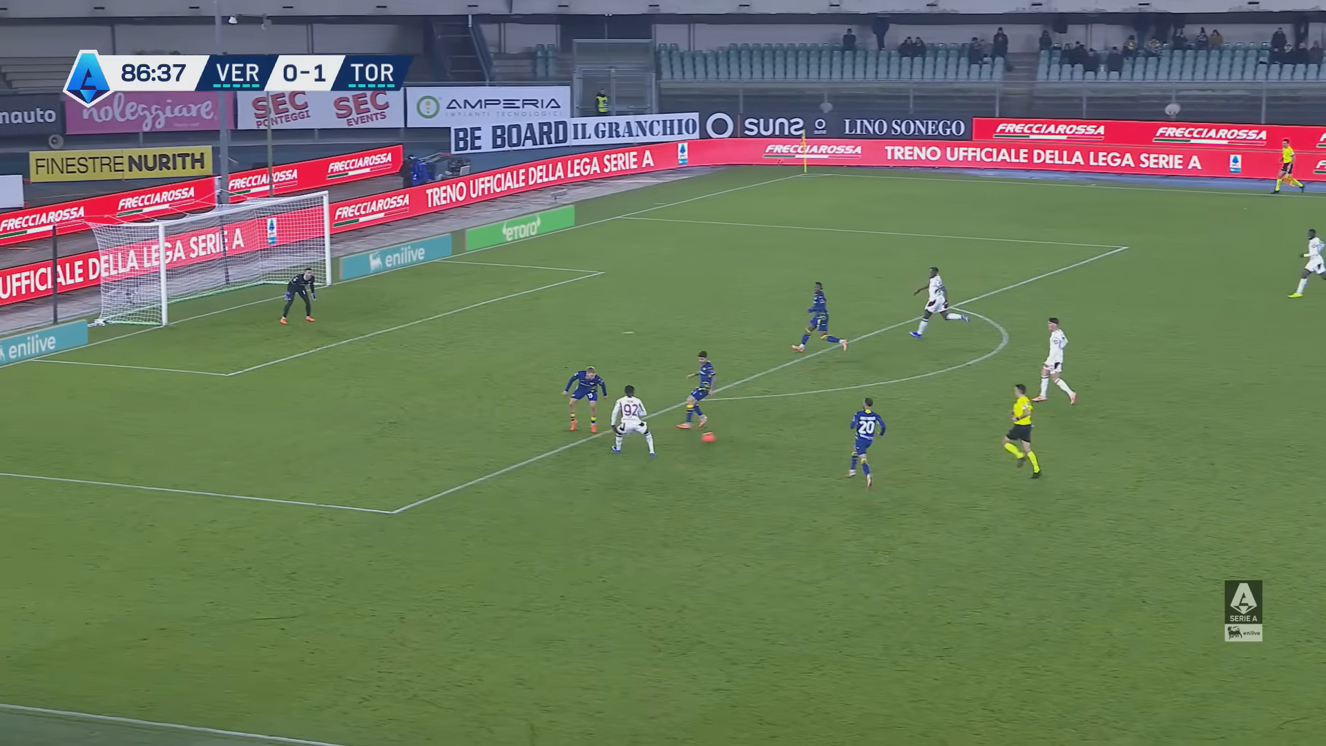 Nel secondo tempo il Verona scende in campo con maggiore determinazione e riesce a creare i presupposti per trovare la rete del pareggio. Tuttavia, la difesa del Toro regge molto bene l'urto e non concede mai delle vere e proprio grosse chance agli avversari, ma solo qualche tiro non troppo pericoloso. Se la squadra di Zanetti alza il baricentro per provare a pareggiare la gara, il Torino decide di puntare su dei contropiedi per cogliere impreparati i gialloblù e così succede all'87' quando arriva il gol di Casadei che nasce da un recupero e un passaggio in profondità dello stesso centrocampista ex Chelsea, come si può vedere nell'immagine 1.