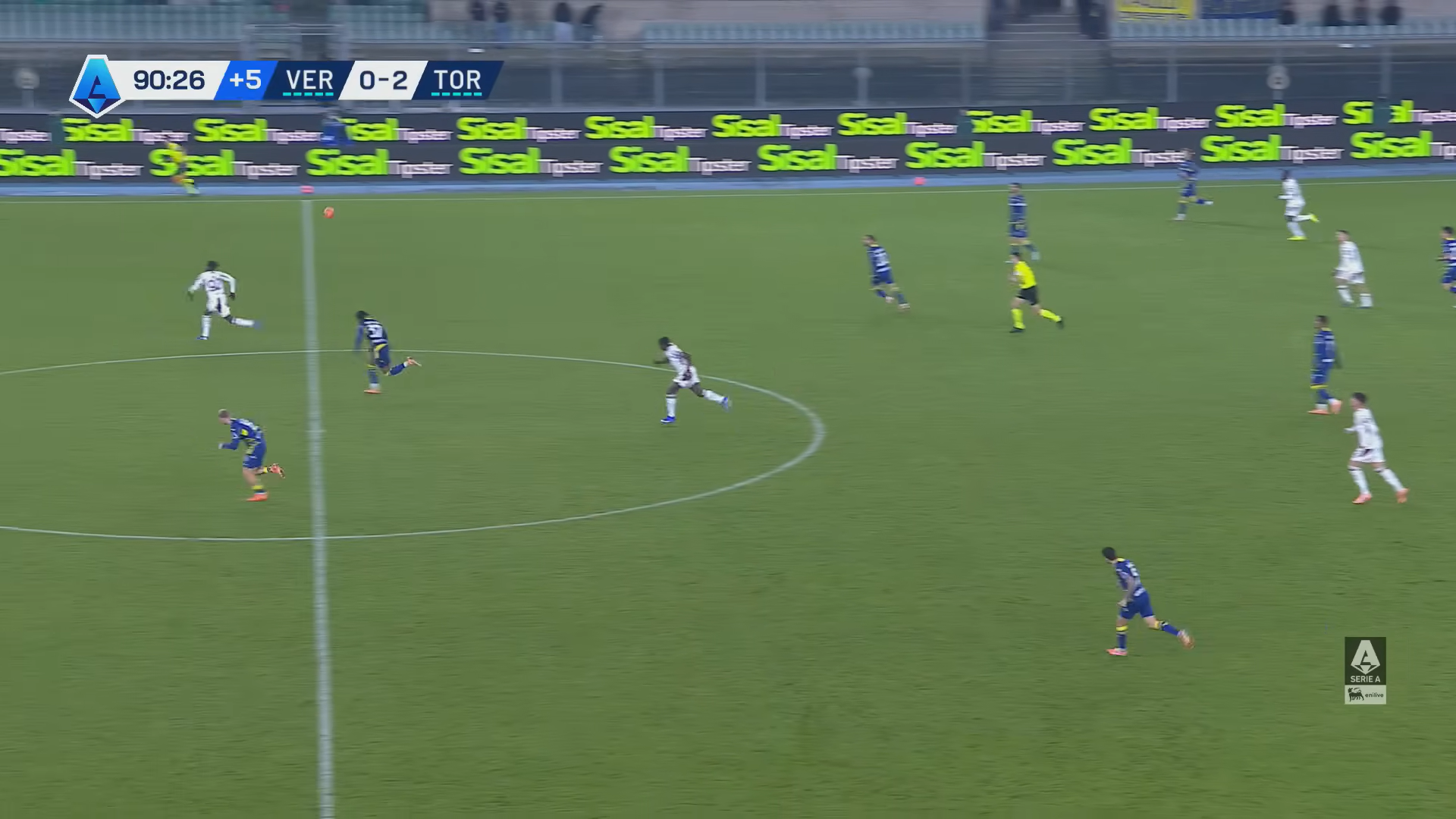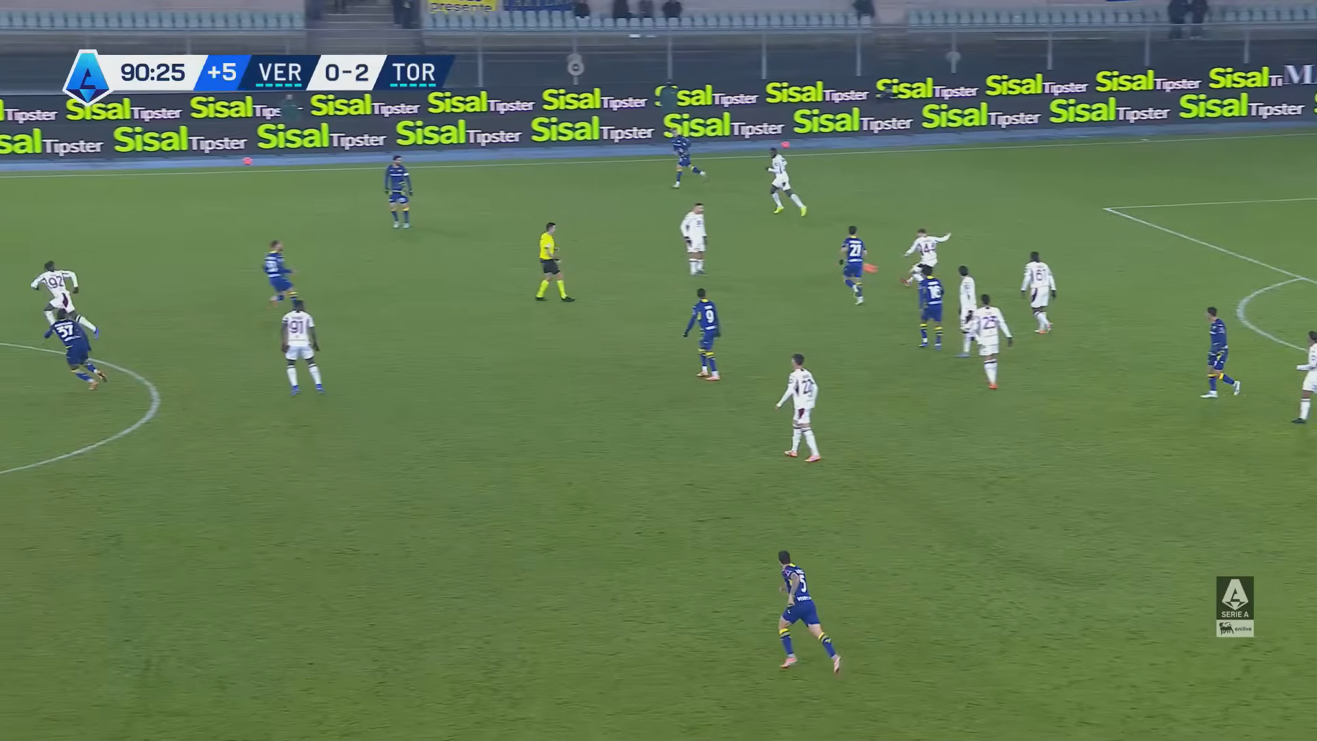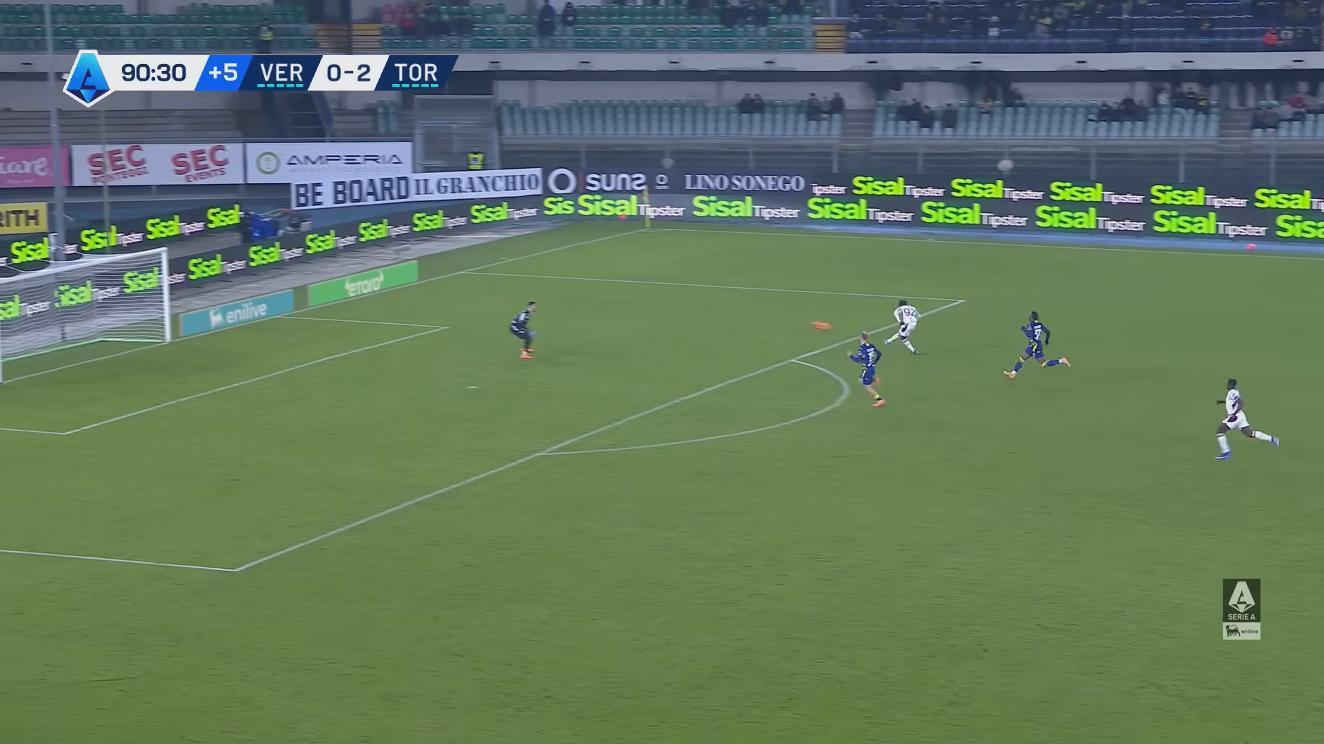 L'ultima parola su questa sfida del Bentegodi la mette infatti la bella rete di Njie. Lo svedese realizza il gol dello 0-3 al 91' e mette la parola fine sulle speranze veronesi. Tutto nasce da un lungo rilancio dalla difesa di Ismajli (immagine 1), il centrale albanese tentando di allentare la pressione sulla difesa del Toro è riuscito a trovare una traiettoria molto ben calibrata e precisa.
