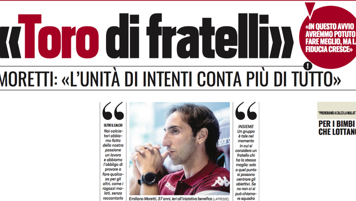 Sull'edizione odierna della Gazzetta dello Sport ci sono le dichiarazioni che ha rilasciato ieri Emiliano Moretti (). "Fidatevi del Toro: lavorando così andremo lontano", questo è il titolo che La Rosa ha dedicato per le dichiarazioni del difensore. Sui Nazionali in granata: "Presto se ne aggiungeranno altri, io sponsorizzo De Silvestri...". Sull'inizio del campionato: "Potevamo raccogliere di più: buttato qualcosa per strada". Sullo spogliatoio: "Questa è una squadra costruita su un gruppo unito". Infine la Gazzetta elogia il difensore: "Un esempio in allenamento e fuori dal campo, il bisogno di spendersi in iniziative sociali", il quotidiano continua: "La sua media dopo le prime tre giornate di campionato è di 6,16: tra i migliori contro Roma e Spal". I dettagli su La Gazzetta dello Sport oggi in edicola.