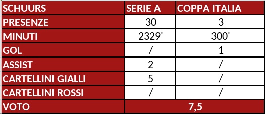 Nel complesso, la stagione di Perr Schuurs è stata molto positiva e per questo la sua valutazione si attesta sul 7,5. L'olandese è stato in grado di garantire un'ottima solidità difensiva e si è integrato nello scacchiere tattico di Juric, capendone subito i movimenti e diventandone presto il leader. Con i compagni di reparto ha trovato un buon feeling e se il Torino ha chiuso la stagione con la quinta miglior difesa del campionato (42 gol subiti), buona parte del merito è anche sua.