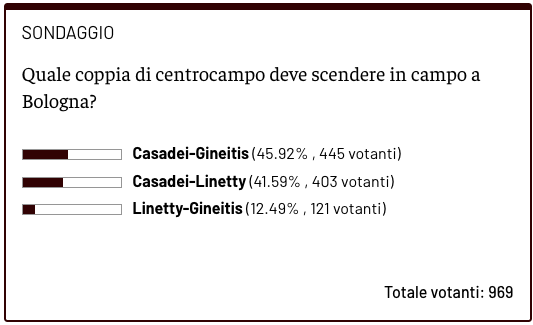 Come sempre abbiamo chiesto a voi qual è la miglior coppia di centrocampisti titolari affinché i granata possano fare bene in Bologna-Torino. I lettori di Toro News sono sicuri di una cosa: Casadei deve partire titolare. L'opzione che rimane più indietro tra i risultati, infatti, è proprio quella Linetty-Gineitis, che ha ricevuto solo il 12,56% dei voti. Seconda per distacco troviamo l'opzione Casadei-Linetty, che si è aggiudicata il 41,59% dei voti. Prima ma molto vicina a quest'ultima è l'opzione Casadei-Gineitis, che è dunque, secondo i lettori di TN, il centrocampo migliore che Vanoli possa schierare contro i rossoblù. Adesso solo il campo potrà dire chi aveva ragione.© RIPRODUZIONE RISERVATA