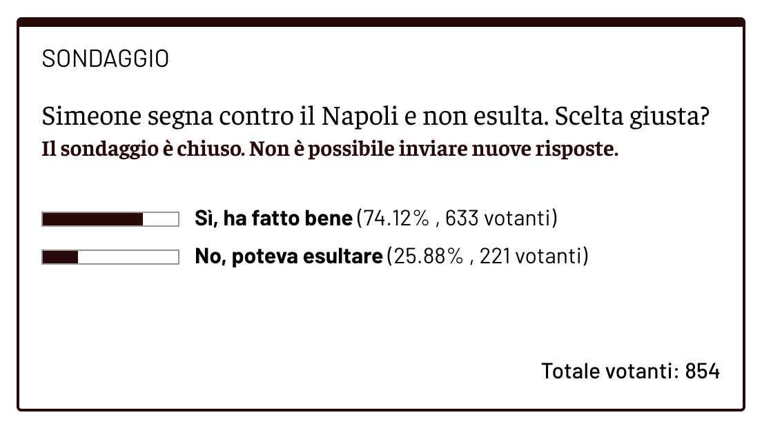 Simeone sta vivendo un ottimo periodo di forma e infatti sta trascinando il Torino con prestazioni di sacrificio impreziosite dai gol. Nell'ultima partita in casa contro il Napoli, i granata sono usciti vincitori per 1-0 grazie alla rete segnata proprio dall'argentino. Rete che ha causato un po' di polemiche per la mancata esultanza dell'attaccante contro la sua ex squadra, con cui ha vinto due scudetti ed esordito in Champions League. Nelle scorse giornate abbiamo chiesto ai lettori di Toro News di dirci la loro opinione a riguardo. Il verdetto si è dimostrato piuttosto sbilanciato, con ben il 74,12% dei votanti che ha selezionato la casella "Sì, ha fatto bene", talvolta esprimendosi nei commenti sottolineando di apprezzare il rispetto professionale verso la ex squadra, a patto che questo - ovviamente - non interferisca sulla prestazione sul campo di gioco. Di seguito, l'immagine della votazione.