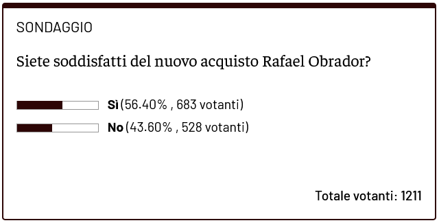 Dopo settimane di attesa, il Torino piazza finalmente il primo acquisto del mercato invernale 2026. Nella giornata di lunedì 19 gennaio, Rafael Obrador ha sostenuto le visite mediche e firmato ufficialmente il contratto che lo rende un nuovo giocatore granata. Il laterale spagnolo arriva in Italia con la formula del prestito con diritto di riscatto fissato a 9 milioni di euro. Baroni aggiunge così alla rosa un quinto di sinistra naturale, mancino, classe 2004, cresciuto nel settore giovanile del Real Madrid ed ex Benfica. In questa stagione Obrador, che al Torino indosserà la maglia numero 33, ha trovato pochissimo spazio sotto la gestione Mourinho, collezionando appena tre presenze. Il trasferimento sotto al Mole rappresenta per lui un’importante occasione di rilancio e di continuità in Serie A. Secondo il sondaggio proposto dalla redazione di Toro News, la tifoseria granata è spaccata in due riguardo all'acquisto del terzino. Il 56.40% dei votanti è soddisfatto del suo acquisto, mentre il 43.60% non è soddisfatta dell'arrivo dell'ex Real Madrid.