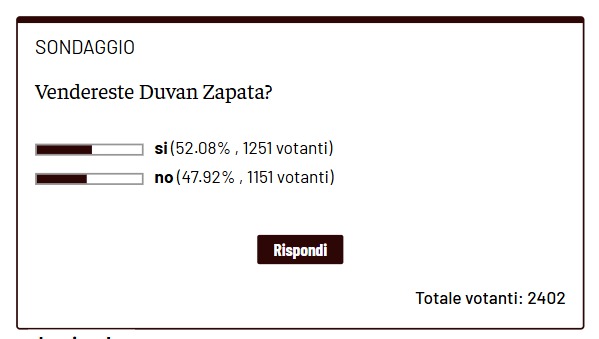 Ma Duvan sembra tutt'altro che un corpo estraneo alla squadra, anzi. E' stato uno dei giocatori mostratisi più entusiasti nell'esultanza ai gol che hanno piegato la Roma in Coppa Italia. Tanto da mettere la parola fine su eventuali mal di pancia e non detti con l'allenatore. Ma, nonostante ciò, quello che fino a qualche mese fa sembrava eresia, con il contratto rinnovato fino al 2027 durante il periodo della riabilitazione, ad oggi potrebbe essere clamorosamente un tema da affrontare. Secondo il sondaggio proposto dalla redazione di Toro News, la tifoseria granata è spaccata in due riguardo un'eventuale partenza dell'attaccante, sondato in queste settimane da alcune squadre di Serie A. Il 52% dei votanti crede infatti che una sua cessione possa essere un’opzione da non trascurare durante questa sessione di mercato, mentre il 48% ritiene che una permanenza di Zapata possa essere un fattore positivo, quanto meno per i prossimi 6 mesi, sia in campo che nello spogliatoio.