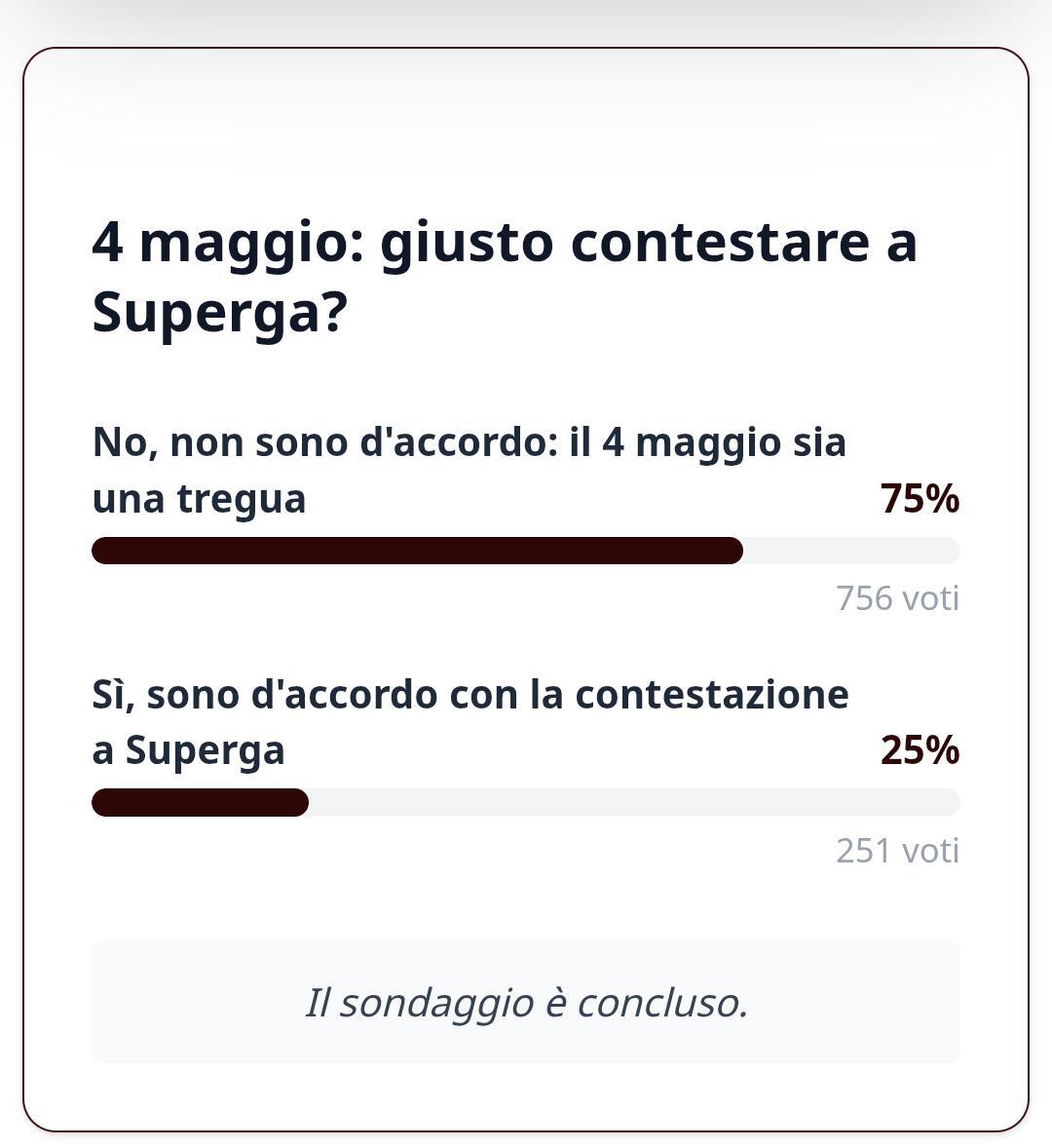 Per questo, noi della redazione di Toro News abbiamo chiesto ai nostri lettori di esprimersi attraverso un sondaggio. Il risultato mostra le due correnti di pensiero ma una delle due posizioni è prevalente: il 75% dei votanti ritiene che il 4 maggio debba rappresentare una tregua dalla contestazione, almeno sotto la basilica di Superga. Il dibattito resta aperto con tutte le sue sfaccettature: come sempre, i commenti sono a disposizione per chi vorrà esprimere una riflessione e spiegare il proprio punto di vista.