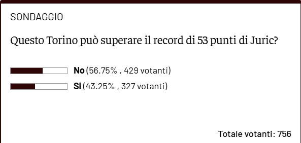Sosta Nazionali vuol dire anche avere un momento per analizzare a tavolino la situazione attuale, tra quanto fatto e quanto si riuscirà a fare nelle ultime gare. Negli scorsi due anni, a fine stagione Juric ha raggiunto prima il decimo posto e poi il nono, entrambi con 53 punti. Ad oggi, Vanoli e ragazzi si trovano a quota 38 punti, con 9 partite da giocare ancora. Abbiamo posto a voi la domanda se Vanoli riuscirà o meno a superare il record di punti di Juric. In 9 partite, per fare tale risultato (conseguendo quindi almeno 16 punti), il Toro dovrebbe tenere una media di 1,78 punti a partita. Questo vorrebbe dire vincerne 5 e pareggiarne almeno una, oppure vincerne 4 e pareggiarne almeno 4. Per fare 16 punti in 9 gare il Torino, in ogni caso, non può permettersi di trovare i 3 punti in meno di 4 occasioni. Una sfida non facile, e ancor meno è prevedere quale sarà il risultato finale dei granata. Anche voi lettori non avete, infatti, raggiunto una netta maggioranza, ma c'è una leggera predilezione per una risposta. Quasi il 57% dei votanti ha espresso il parere secondo cui il Toro non riuscirà a conseguire nelle restanti 9 partite almeno 16 punti. Rimane comunque alta (oltre il 43%) la percentuale di quelli che ritengono invece che Vanoli riuscirà, al suo primo anno in granata, a superare il record di Juric.